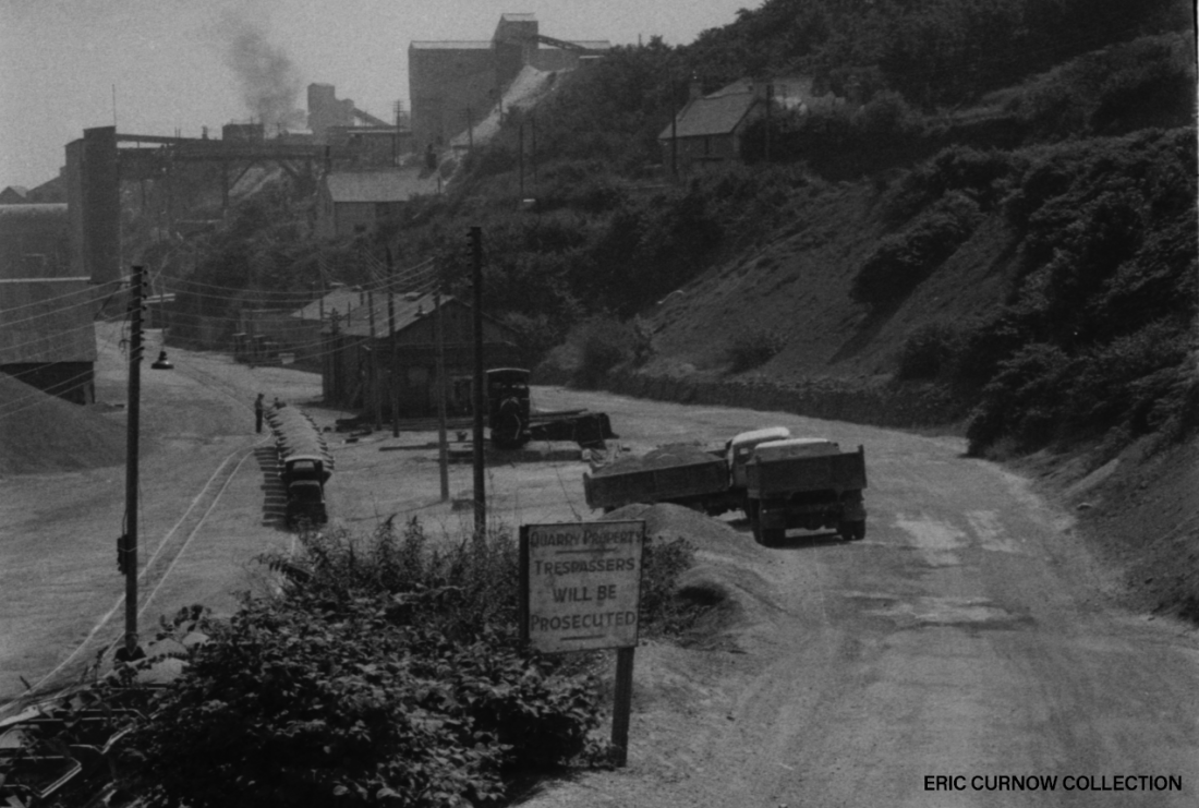 These Bedford lorries were once a common sight shifting huge boulders through the streets of Newln and Penzance, shown here on the lower quarry site below the Mousehole Road. Adjacent to them is a train of filled hoppers and the old Steam loco that used to ply this route. Signs like the one in the foreground were deterents to trespass, but not necessarily effective! 63####A01-NYN-D_LCO-MINLS