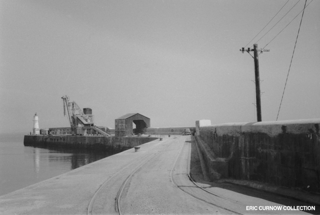 The sea is calm before Newlyn’s North Pier and apart from the ubiquitous fisherman by the lighthouse and workmen sitting in the shade of the wall, all is imobile. The two tracks were for the little Ruston diesels to run back and fprth, their train of hoppers being tipped over under the shed and the crushed greenstone taken by conveyors to the loading equipment for the stone boat’s holds. 63####A01-NYN-PIERS-VI__E