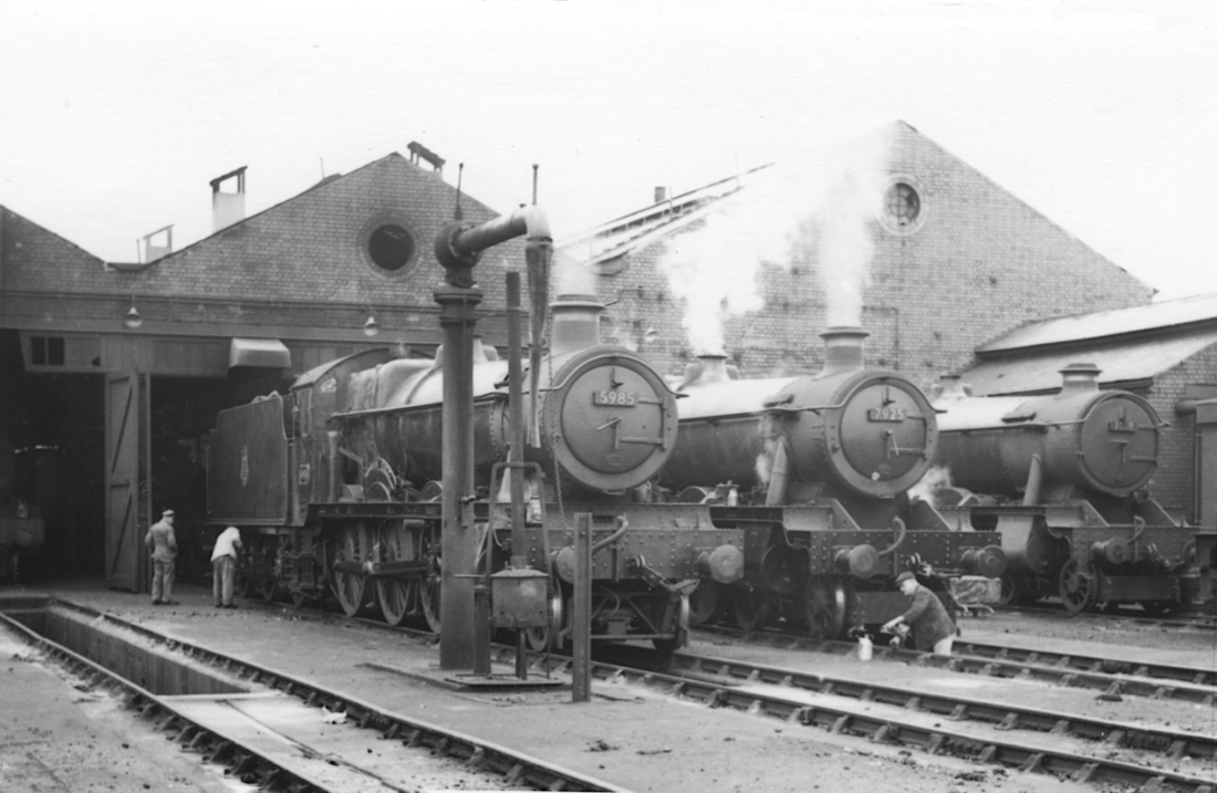 At steam’s zenith 5985 “MOSTYN HALL”, 7925 “WESTOL HALL” and 1018 “COUNTY OF LEICESTER” are on the aprom at Long Rock Depot, the first two still in steam and the ‘County’ awaiting attention in the Fitting Bay. In the foreground is a water column and fire devil, and to the rear a new white ventilation unit; locomen attend to their charges. Photo: F Hornby. 65####A01-LRK-DEPOT-VI__W