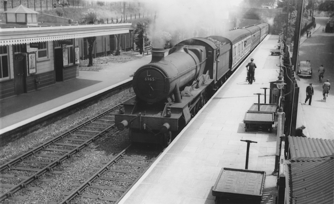 Trolleys lie ready, and a porter takes a barrow along the platform seeking a gratuity or maybe two, as 6965 “THIRLESTAINE HALL” rushes in to St Austell station with a down Plymouth to Penzance service in June 1955, Palm trees are evident on the up platform: and the street opposite is busy with those coming or going about their daily business. By kind permission R.K. Blencowe. 5506##A01-STA-s6965-PAS_D