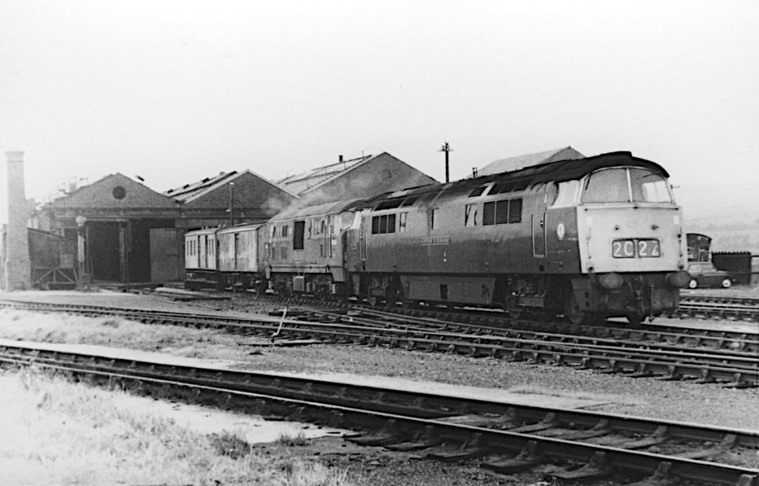 Double-heading of locomotives was relatively rare in West Cornwall, but here D1011 “WESTERN THUNDERER” (leading) and D1037 “WESTERN EMPRESS” (trailing) head a service to Bristol in 1973; 1011’s engine turns over but 1037 isn’t emiting exhaust. The platform has collected weeds down its centre, and plastic bags for rubbish hang over some railings nearby. 73###AH01-PNZ-2X52S-PAS_U