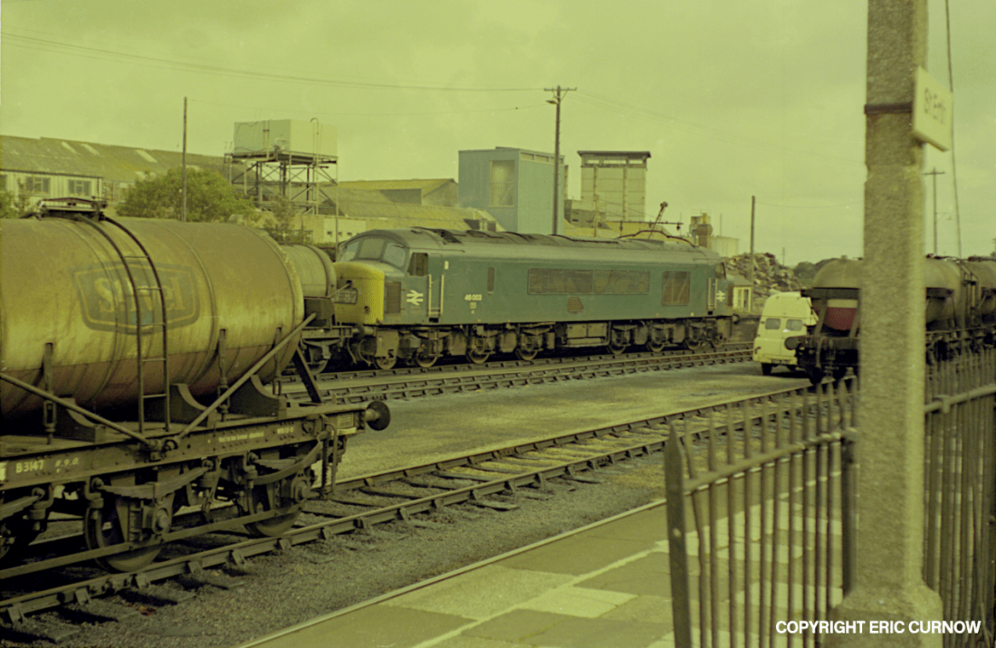 46003 shunts tanks at St Erth, with the Creamery and scrap yard behind it and loose milk tanks closest to the empty branch platform in the foreground. The tanks were invariably in a dirty external state – doubtless spotless inside – and in my experience usually unpainted, Here some are branded ‘St Ivel’ – a West of England trade name hinting at a Cornish origin, and used for a while. 740910B01-STE-46003-M_STG
