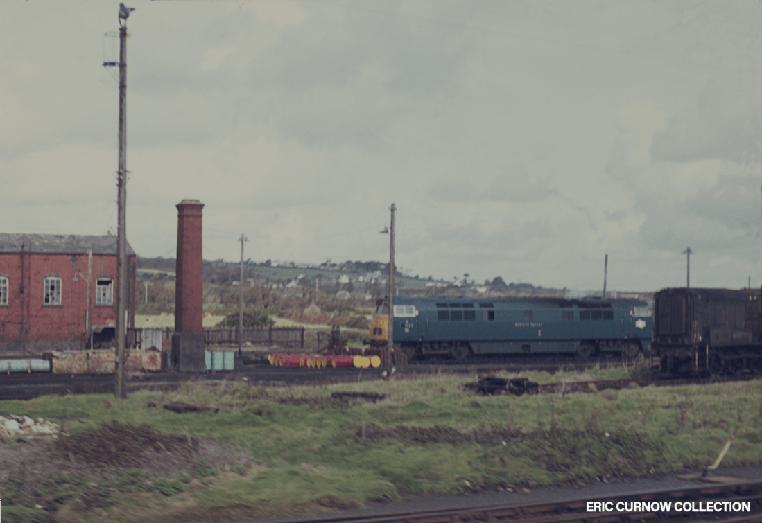 With a plume of exhaust pumping away, D1051 lumbers across the foot crossing at the west end of Par Station, rocking a bit as it gathers momentum. Centrally ahead is the Wesleyan chapel, and running towards it, Chapel Siding. Between the building and “WESTERN AMBASSADOR” on the skyline is the huge china clay dries, plus its chimneys, and to the right, the village of St Blazey. 7####IA09-PAR-D1051-PAS_D