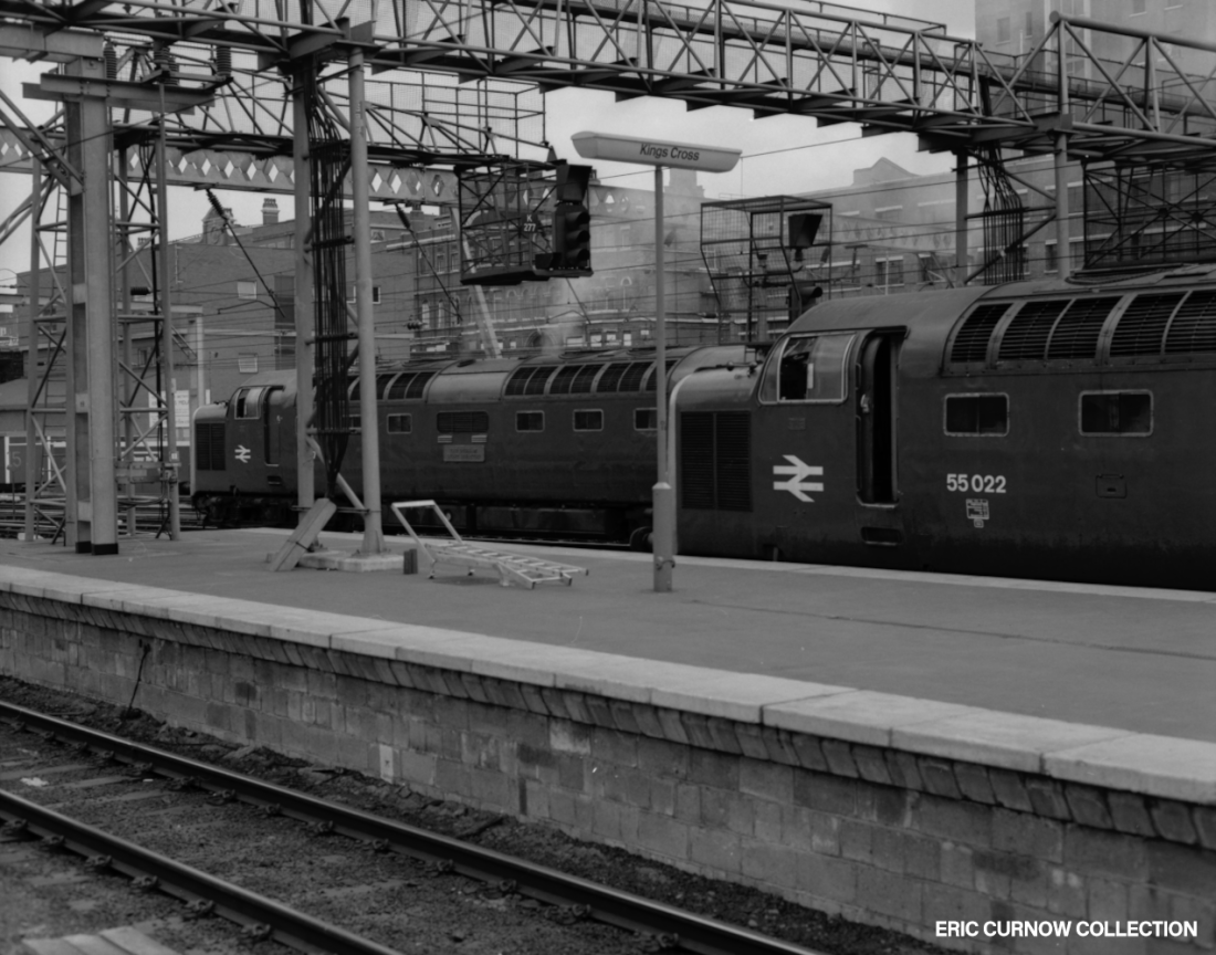 A huge web of electical and structural steelwork hangs above 55022 “ROYAL SCOTS GREY” and 55017 “THE DURHAM LIGHT INFANTRY” at the end of the platforms at Kings Cross station, waiting to take passenger services north. Fencing around the new Signal Box is still in situ, and the whole scene has a freshness about it from the vast amount of money that has been spent. 77####A01-KGX-DLTCS-PAS_D