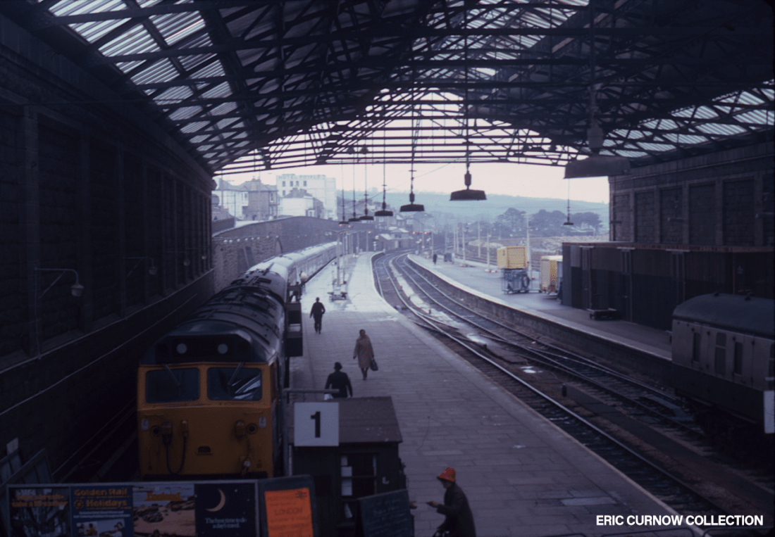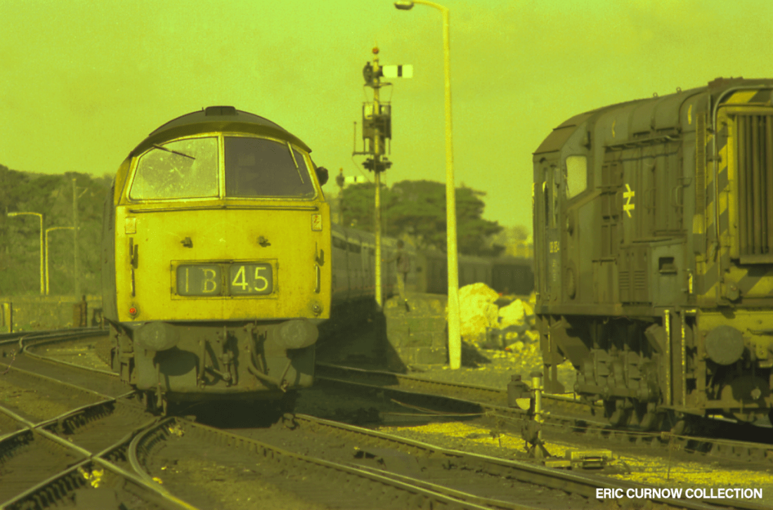 D1051 is guided by pointwork from the through road onto the down main platform at Exeter St David’s Station, passing a Class 33 diesel temporarily parked between services by Exeter Middle Box, just clear of Red Cow Crossing. Behind the signal box is the GWR Broad Gauge Goods Transit Shed that was sadly later burned down, so put beyond the reach of any preservation attempt. 7####IA05-EXD-33###-PARKD
