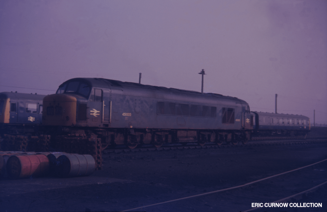 Summer twilight in the 1970s finds 45003 parked on Long Rock depot with a 3-car DMU set behind, presumably from the St Ives workings earlier that day. The ‘Peak’ has inset split headcodes and, unusually, a number at both ends of its body when in BR blue. Fuel drums and brake blocks lie neatly grouped nearby, and a very dodgy piece of track is in the foreground. 7####IA16-LRK-45003-PARKD