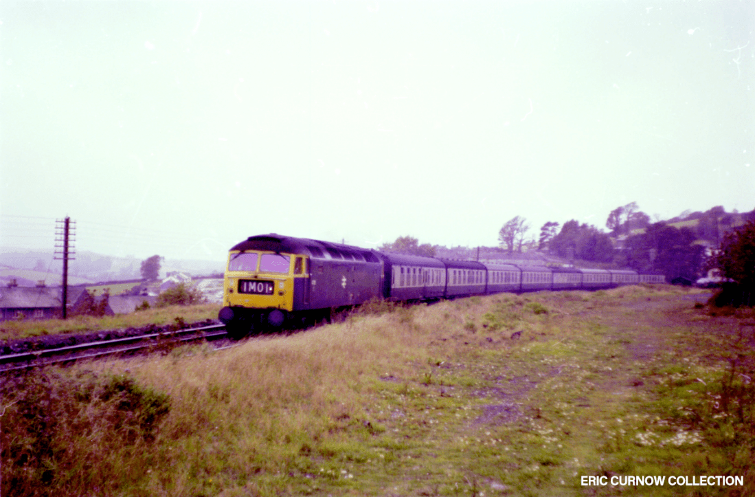 On 12th September 1974 47110 powers through St Germans Station, passing the site of the former Goods Yard on the right, track long ago lifted and now flanked by rank grass and bearing patches of stunted growth on the former ballast. It is heading towards the Midlands with seven Mk1 carriages, on what looks like a damp day. It seems the loco once had a silver painted roof. 740912B01-STG-47110-PAS_U