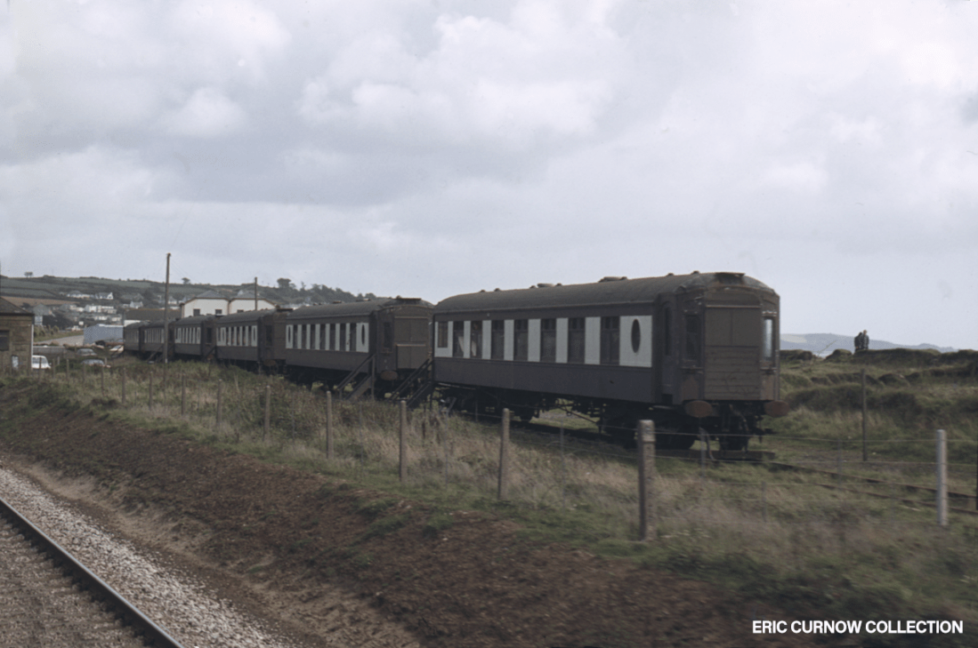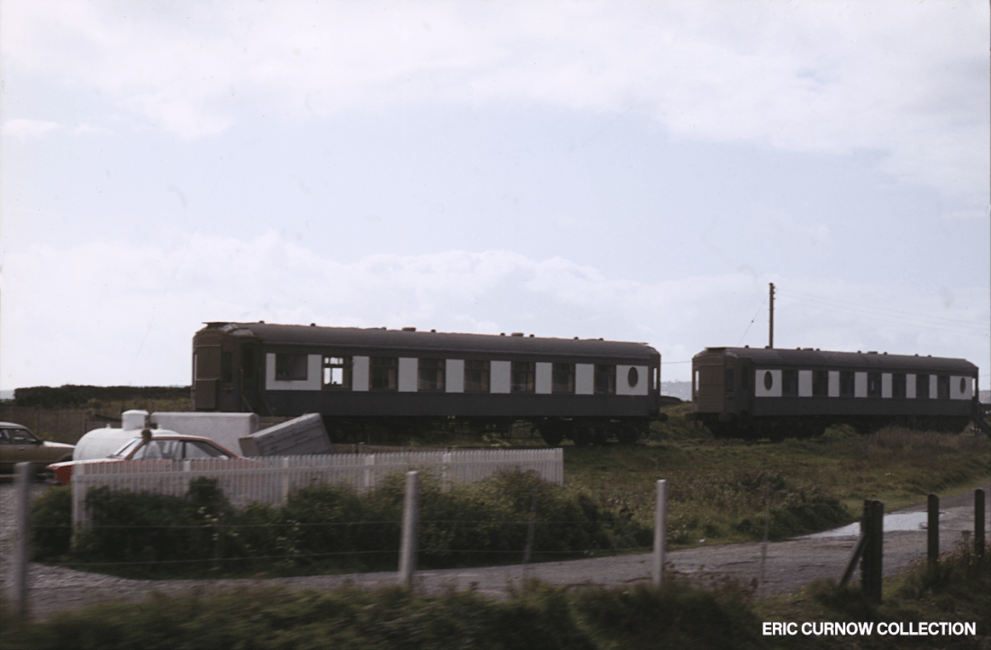 The six former Pullman coaches, long ago turned into holiday accommodation, are viewed from the tail end of a west-bound train on 12th September 1980. The cut-back soil marks the position of the former down platform and the concrete uprights of the fence have been supplemented by a similar newer fence across the siding tracks to the sea side boundary, Photo: Edgar V Richards. 800912A01-MZN-COACH-V!_SE