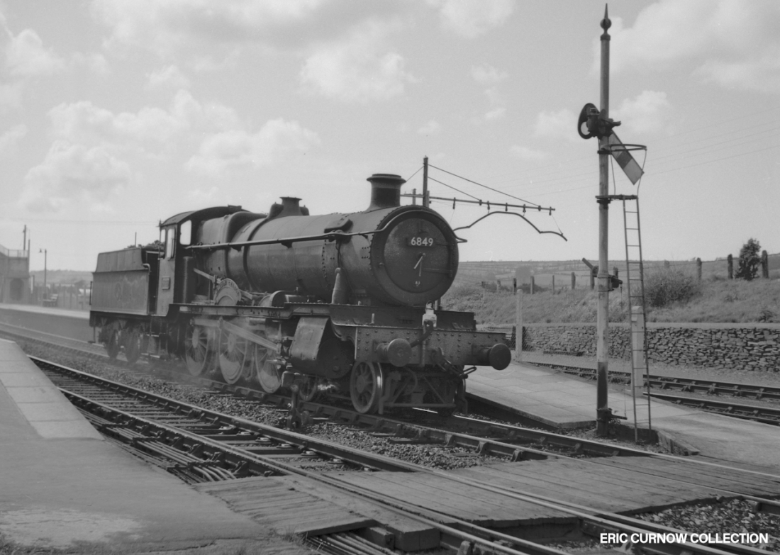 Wearing a Laira (Plymouth) shed plate below its smokebox number, 6849 “WALTON GRANGE” clanks through Marazion Station light engine during May 1958. The station layout is very neat with manicured track, board crossing, reduced-height signal, loading gauge and retaining wall, and the sun, high clouds and deep shadows suggest a fine day. 5805##A01-MZN-s6849-LIG_U