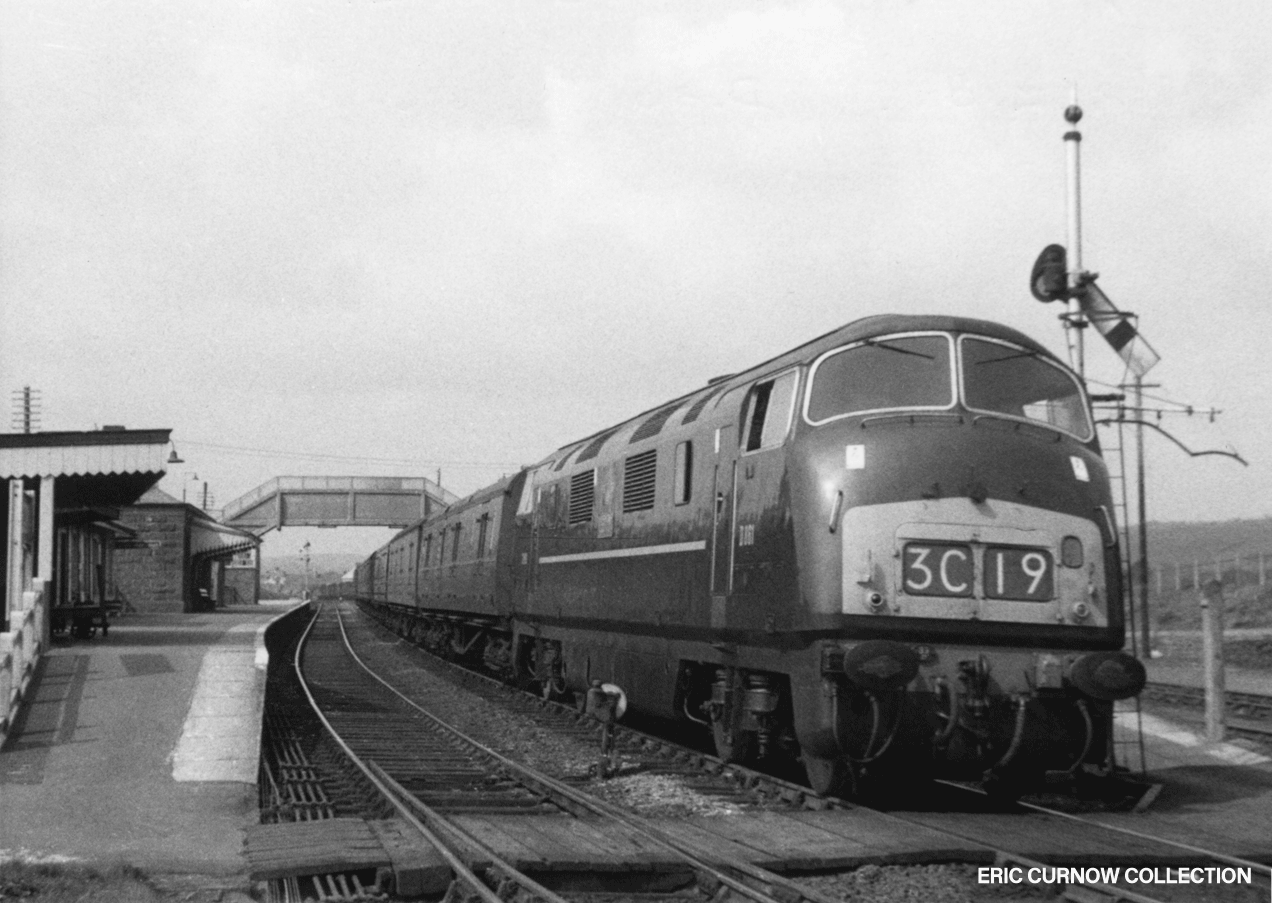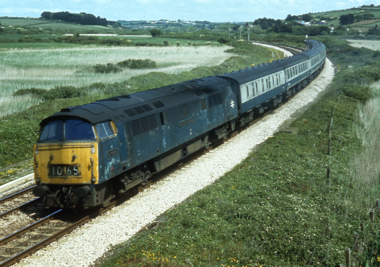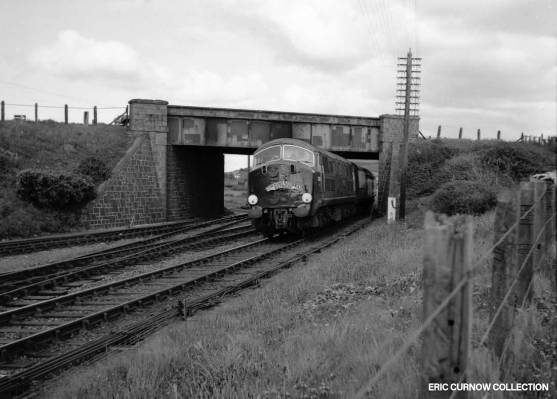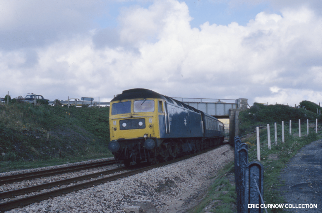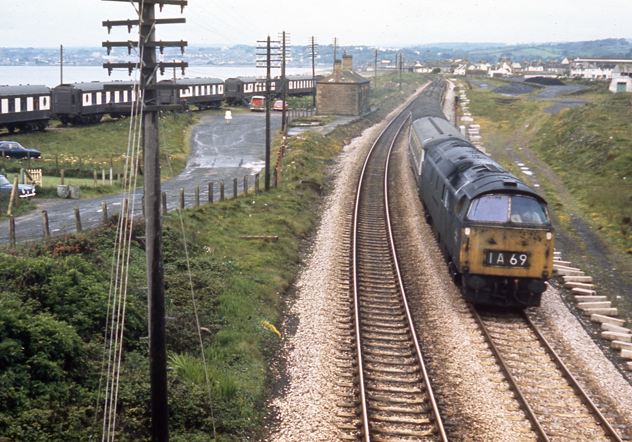 D1001 “WESTERN PATHFINDER” heads the 1A69 at Marazion, passing the former station site and its line of camping coaches on 8th June 1976. Concrete channelling for the new signalling has been placed beside the track and both lines have been recently re-ballasted. In the yard is a heap of domestic coal awaiting collection and delivery. A ‘Modern Image’ slide. 760608A01-MZN-D1001-PAS_U