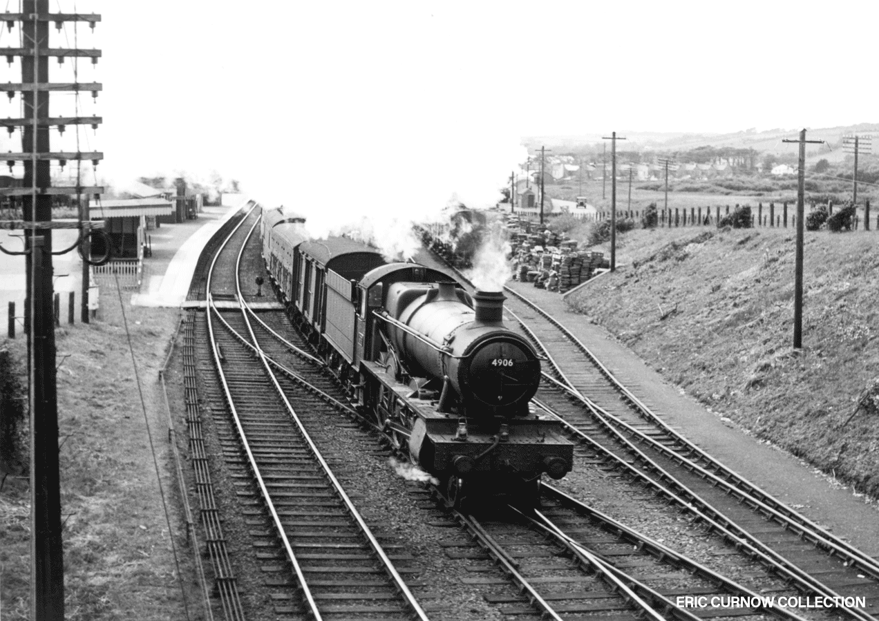 Passing milepost 324/III and leading off a train of agricultural vans, 6868, Penzance-allocated “PENRHOS GRANGE” takes the strain prior to joining the main up at Marazion Station in 1959. Behind is St Theresa’s, the Cheshire Home; ‘Bog Plantation’; and the top of the weighbridge hut. A concrete ballast bunker for touching up track voids is in the foreground. 59###AH01-MZN-s6868-GDS_U
