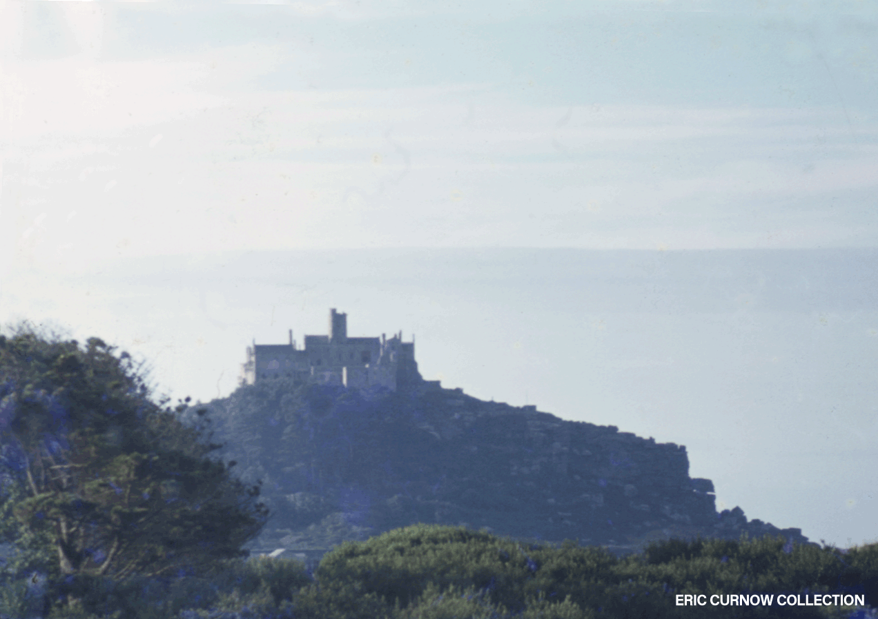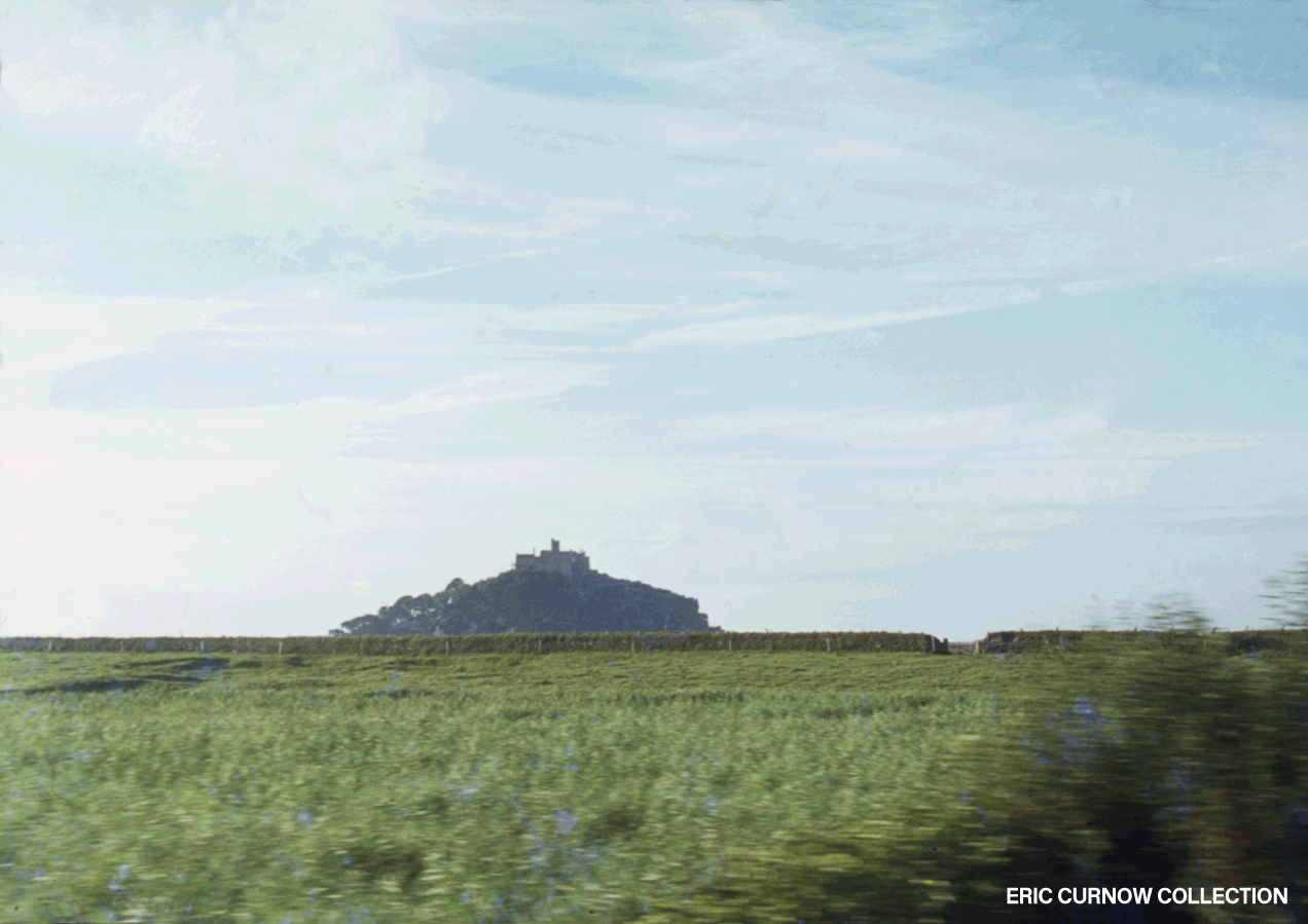 The view seaward from Marazion Marshes as a train sped up line in 1978: St Michael’s Mount is seen across the reeds and Cornish wall with the coastal road on it. The Mount is always a “moving” sight for me – welcoming or portending separation for months. 780823A03-MZN-ST_MM-VI__S