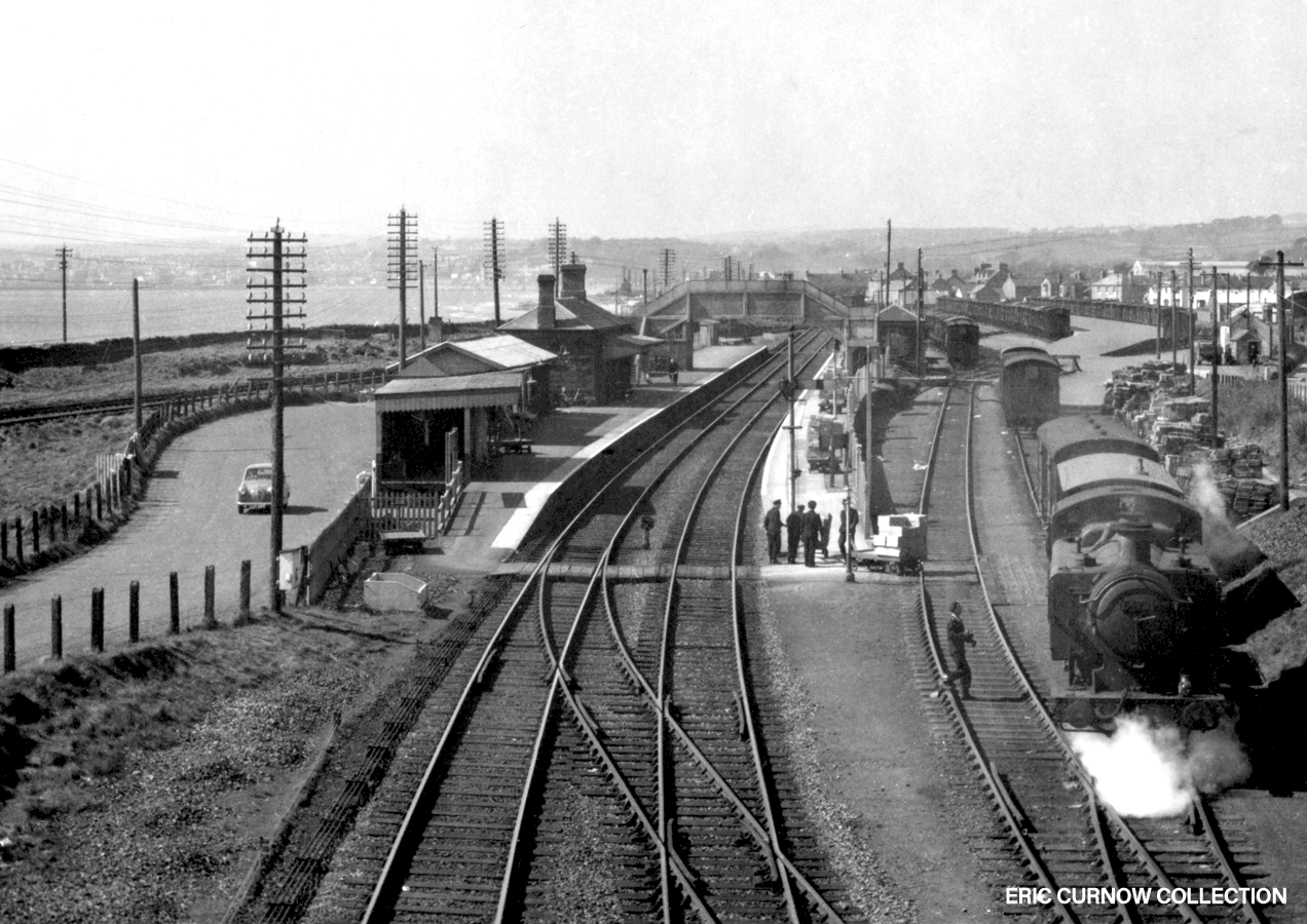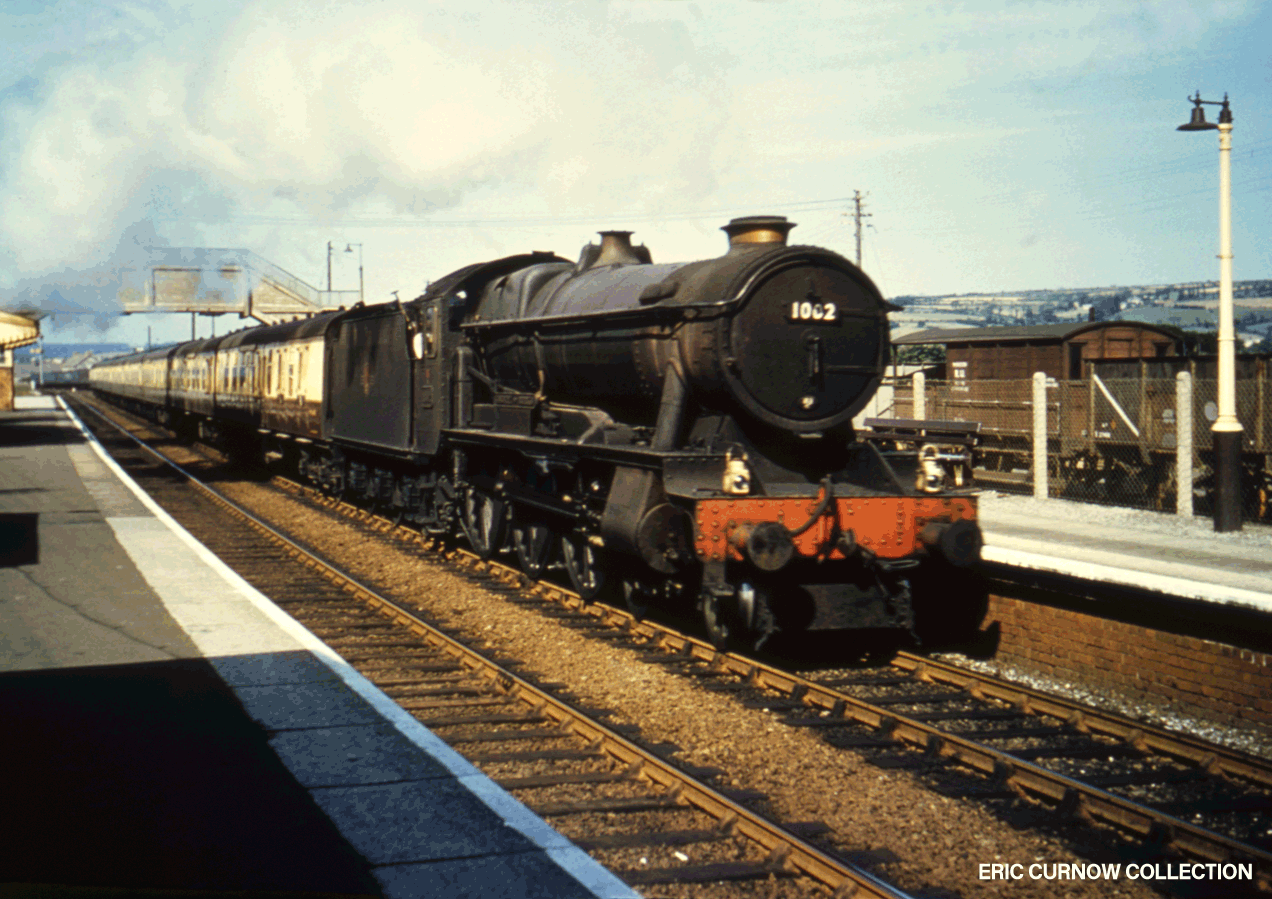 Steaming through Marazion Station in the Summer of 1959, 1002 “COUNTY OF BERKSHIRE” looks unlikely to stop. Its train is in GWR livery and the whole scene seems nearly ‘pre-nationalisation’. I was a toddler of three at this time – living 2 miles away. 59####A01-MZN-s1002-PAS_U