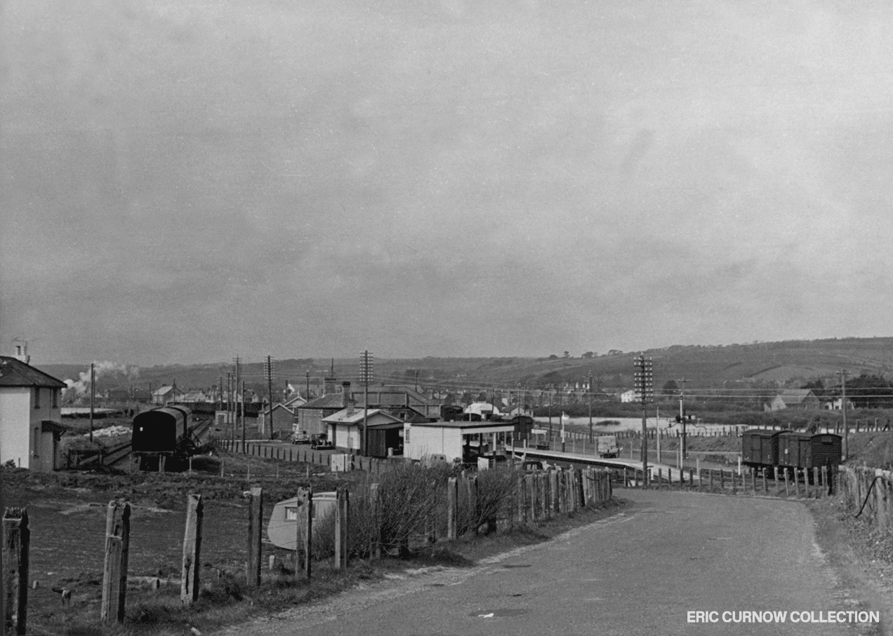 Marazion Station is viewed from the approach road showing standard ex-GWR Camping Coaches in the down side sidings and, opposite, various arrays of vans. The Station Master’s House is on the far left, where smoke rises from Long Rock depot behind. 6204#DF01-MZN-STATN-VI__N