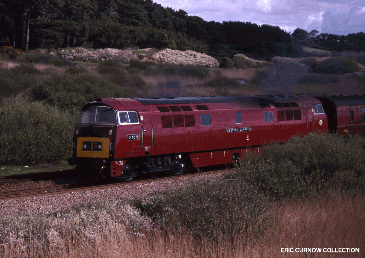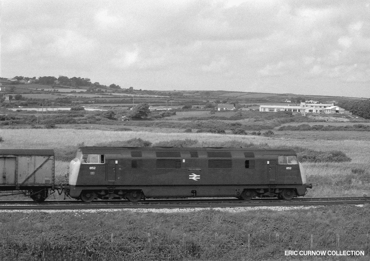 North British built ‘Warship Class’ 852 “TENACIOUS” – minus its diamond builder’s plate – growls around the curve through Marazion Marshes with an “up” freight. The building complex in the pastoral background is a well-known local feature – a Leonard Cheshire Home. 6####EX02-MZN–D852-GDS_U