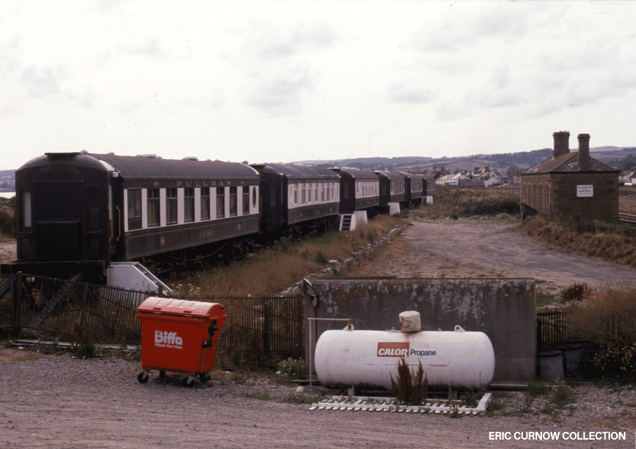 This scene behind Marazion Station’s station building shows the five ex-Pullman Car Camping Coaches in 1989. They are parked in a siding with gaps between and access steps added. As can be seen, gas is also supplied to supplement the water and electricity. 890728A01-MZN-SYARD-VI__W