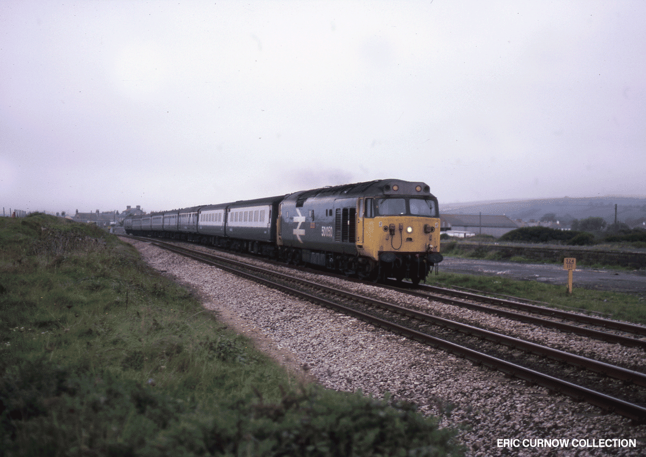 50050 “Fearless” heads an up passenger service of mixed ACS, Mk1 Kitchen, Mk2 and GUV towards the site of the former Marazion Station, past an overgrown goods platform and the 324/III milepost. Thick grass hummocks form the bank opposite. 8509#AA02-MZN-50050-PAS_U