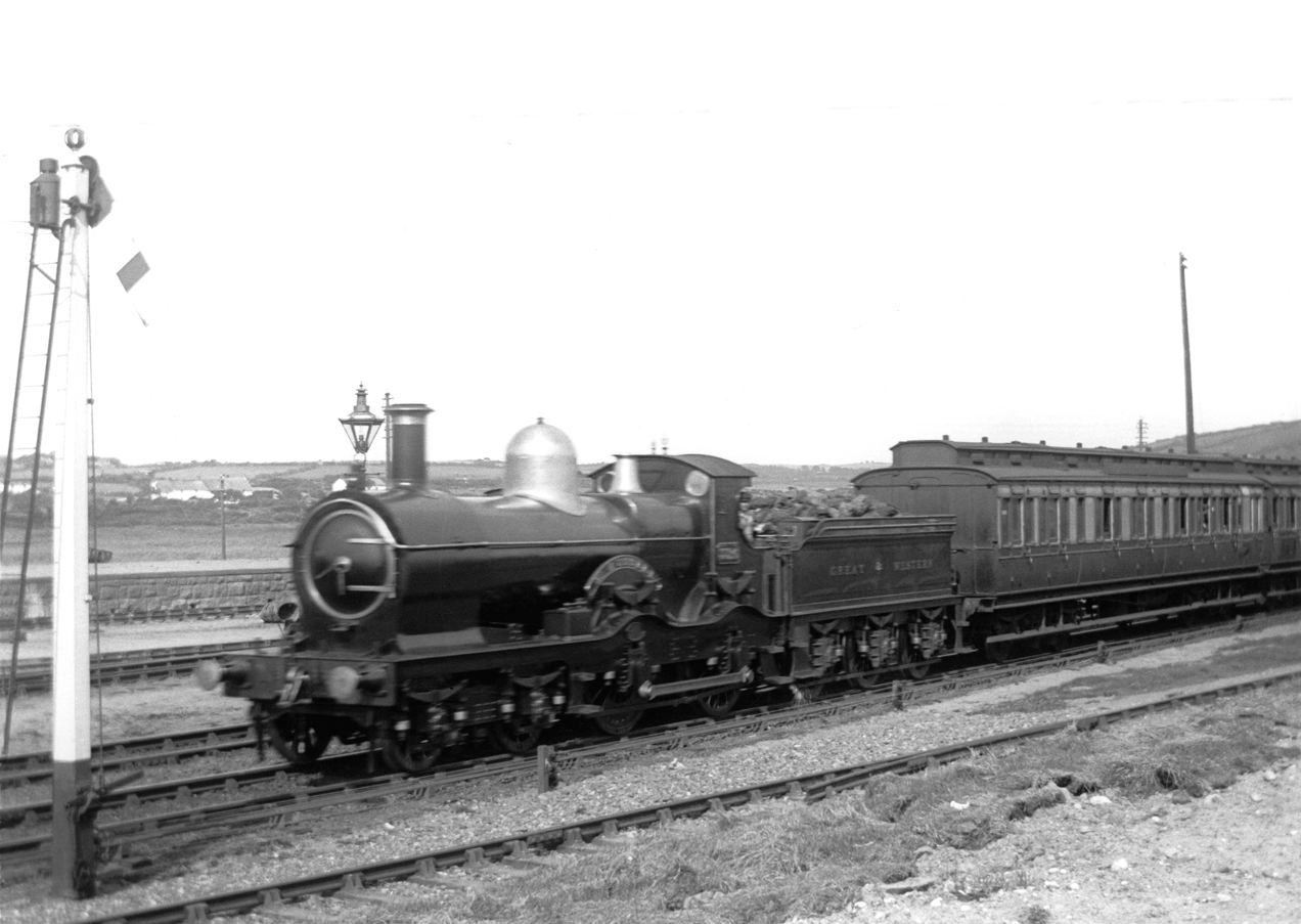 In contrast to the coaches behind, 3326 “ST AUSTELL” is in very presentable form as it leaves Marazion for Penzance in 1907 with a local passenger service – its tender showing no sign of the depletion a longer journey would make. Behind it are the sidings and loading bay of the station, and further back the marsh and outskirts of Long Rock village. 07###AA01-MZN-s3326-PAS_D