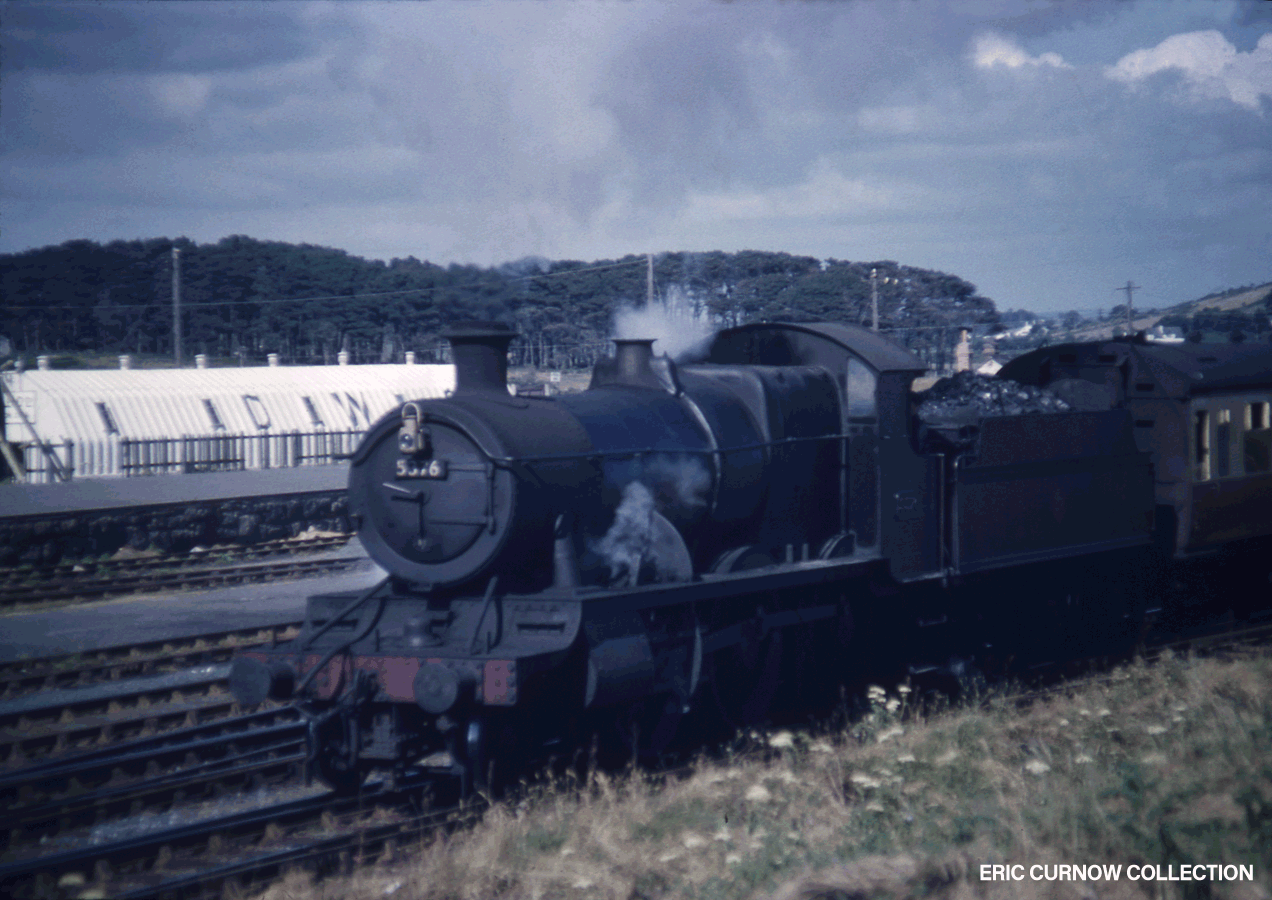 5376 heads a local passenger service through Marazion Station – this view is at the west end with the distinctive pine wood in the background; the long white prefabricated building; and one of the loading platforms. The black liveried loco, oozing steam, surprisingly has a rather full bunker, and heads a chocolate and cream rake of coaches. 59####999-MZN-s5376-PAS_D