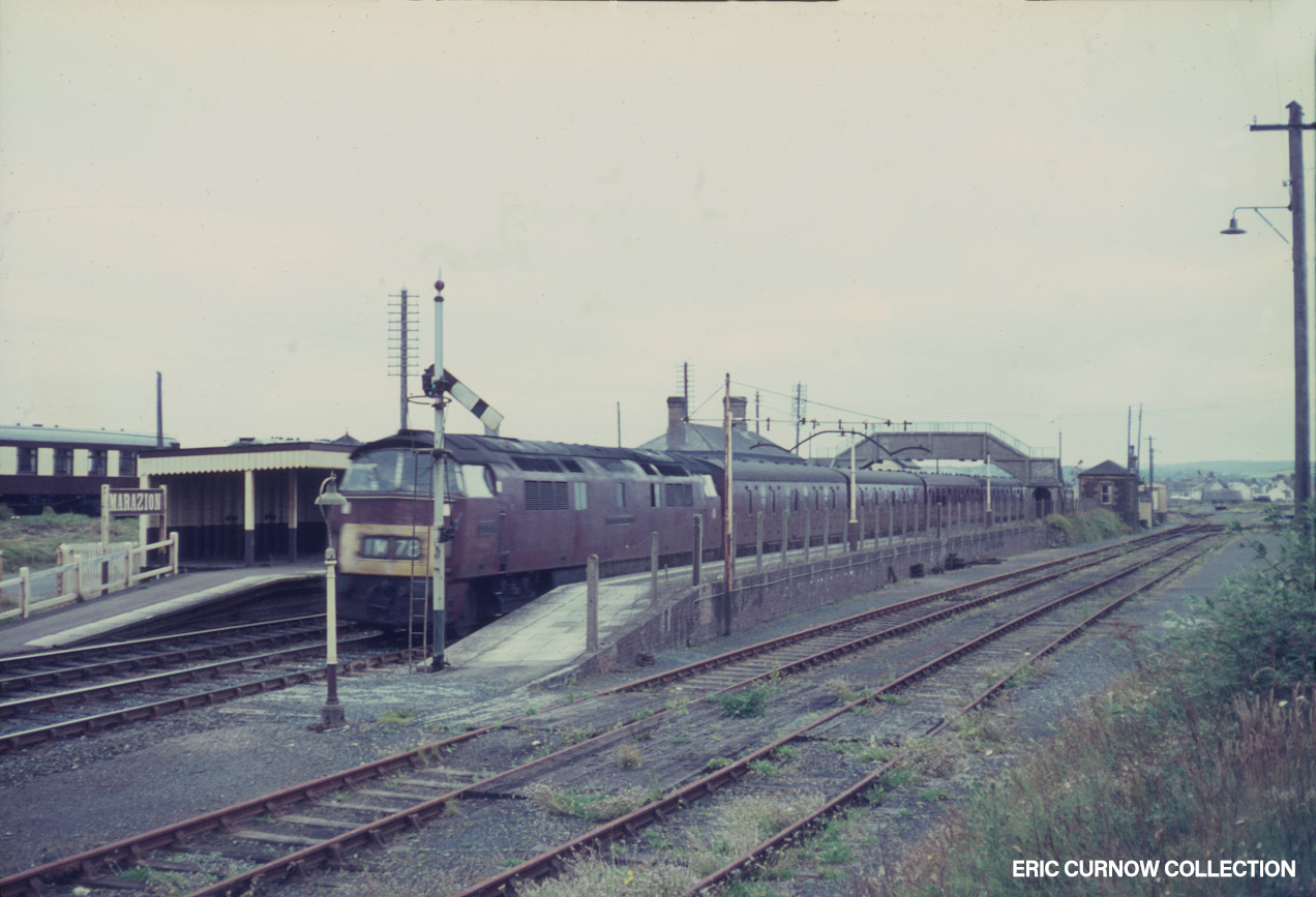 Partially-truncated tracks into Marazion goods yard still exist along with rusting barrow crossing lamp post and loading gauge, as D1063 “WESTERN MONITOR” passes through with the 5.20pm Penzance to Manchester on 12th July 1966. The signal box still pulls off the signals at this time, but was to close about a couple of months later. 660712A01-MZN-D1063-PAS_U