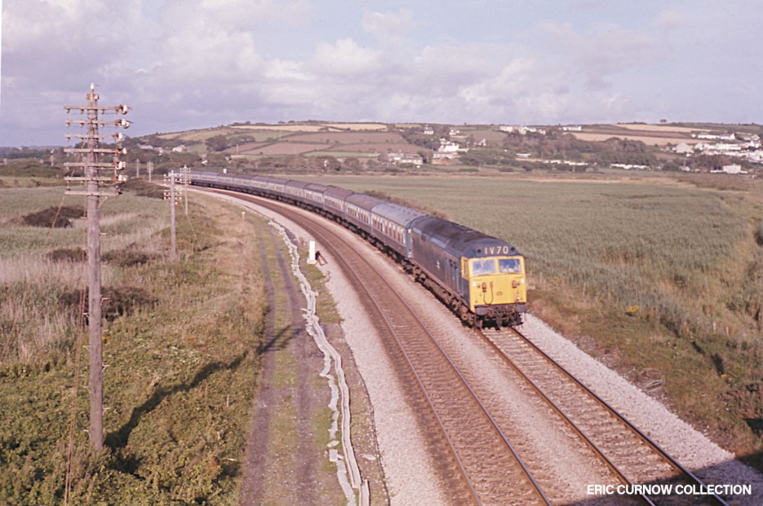 Long shadows from the setting sun and rippling reeds from the persistent breeze surround 50007 “HERCULES” as it crosses Marazion Marshes with an inter-regional express in September 1974. Telegraph poles still flank the trackside, though concrete conduit lying in order nearby – for cabling the electric signal partially hidden behind the ninth coach – forbodes its demise. 7409##A01-MZN-50007-PAS_D