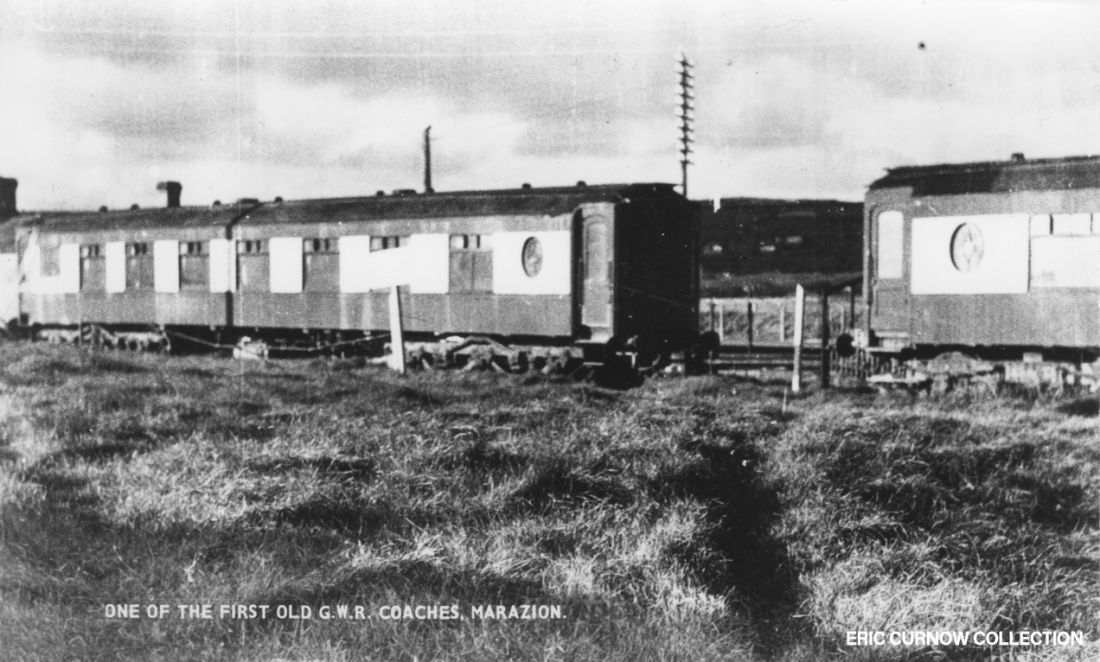 This rather unattractive postcard view of Camping Coaches at Marazion show delapidation, suggesting it was printed post-WW2 when resources of all sorts were scarce. A well-worn track runs toward the sea, a privacy sign hangs at an angle, and the boundary fence is broken – behind is the main line, station building chimneys and Long Rock village. #####AZ01-MZN-COACH-PARKD
