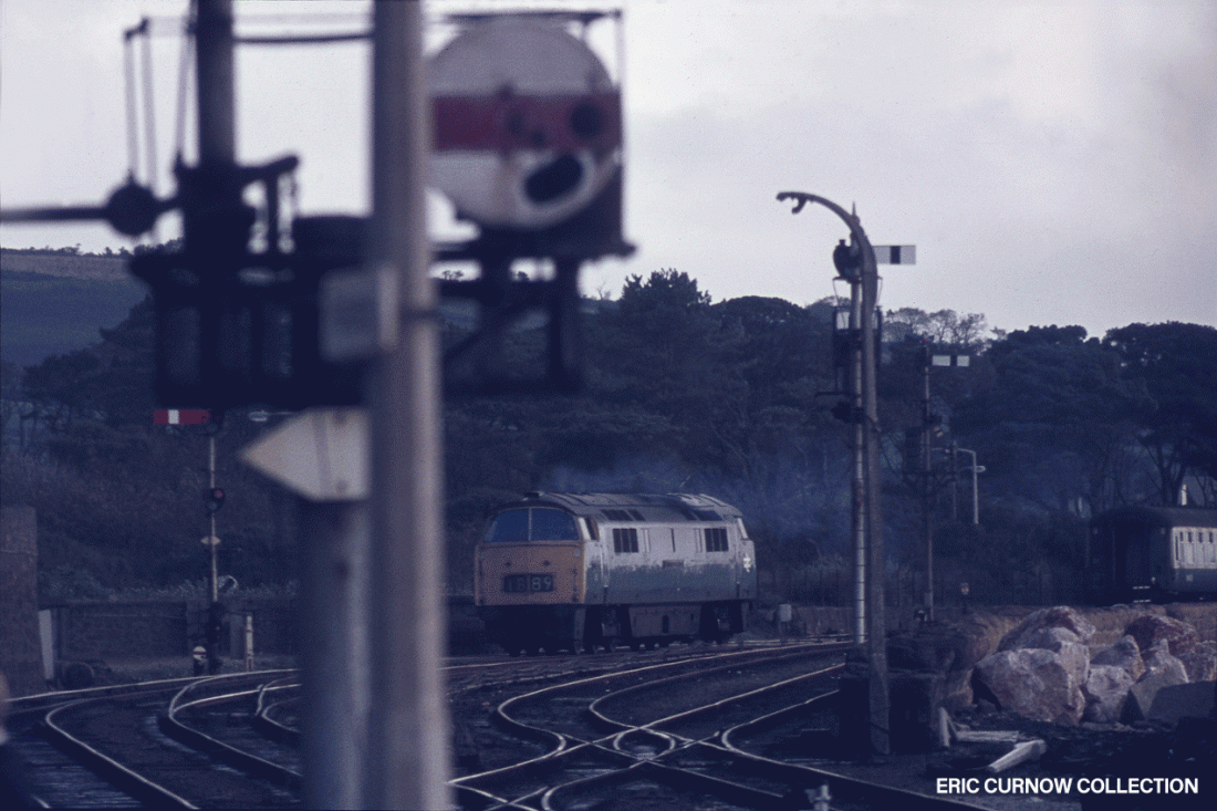 In September I noted what I think was D1033 “WESTERN TROOPER” leading a dynometer car and a couple of carriages up the main line, and D1064 “WESTERN REGENT” in A+++ condition with white wheel rims on one side, but not so treated on the other. My first 50/52 sighting was when 50050 and D1072 “WESTERN GLORY” arrived on a down passenger in Penzance on the 20th, and I recorded damage to “ODIN”’s plate and the absence of “ISAMBARD KINGDOM BRUNEL”’s. The year drew to a close with the demolition of Ponsandane and Long Rock signal boxes, and telegraph poles lopped as far as Marazion. Sad it was that no longer would I hear the whistling of the wind off the sea in the rigging of the telegraph, the ring of bells in the signal boxes as I passed their sites, nor the clang of a semaphore as a lower quadrant fell into place.