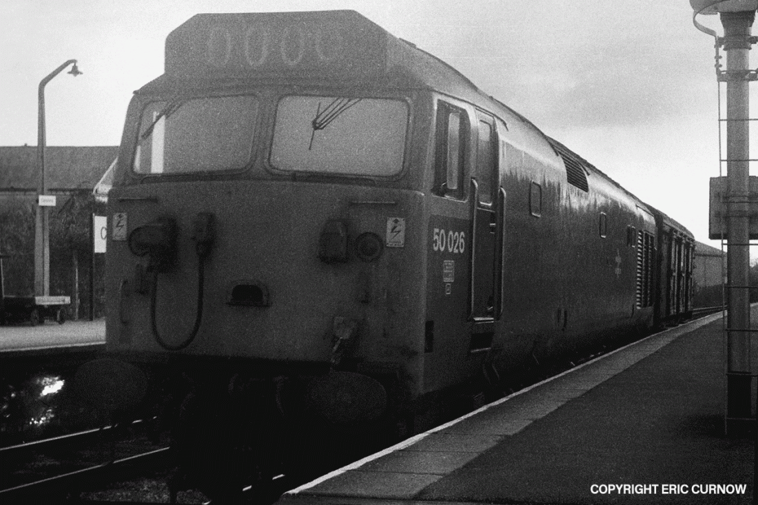 Looking up line from the far west of a deserted Camborne station, 50026 passes through with a single van – a significant over powering for this task. Its headcode has been reset to zeros, and it bears a Laira allocation patch. 760407A00-CBN-50026-GDS+D