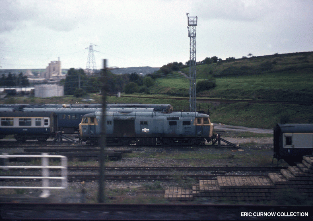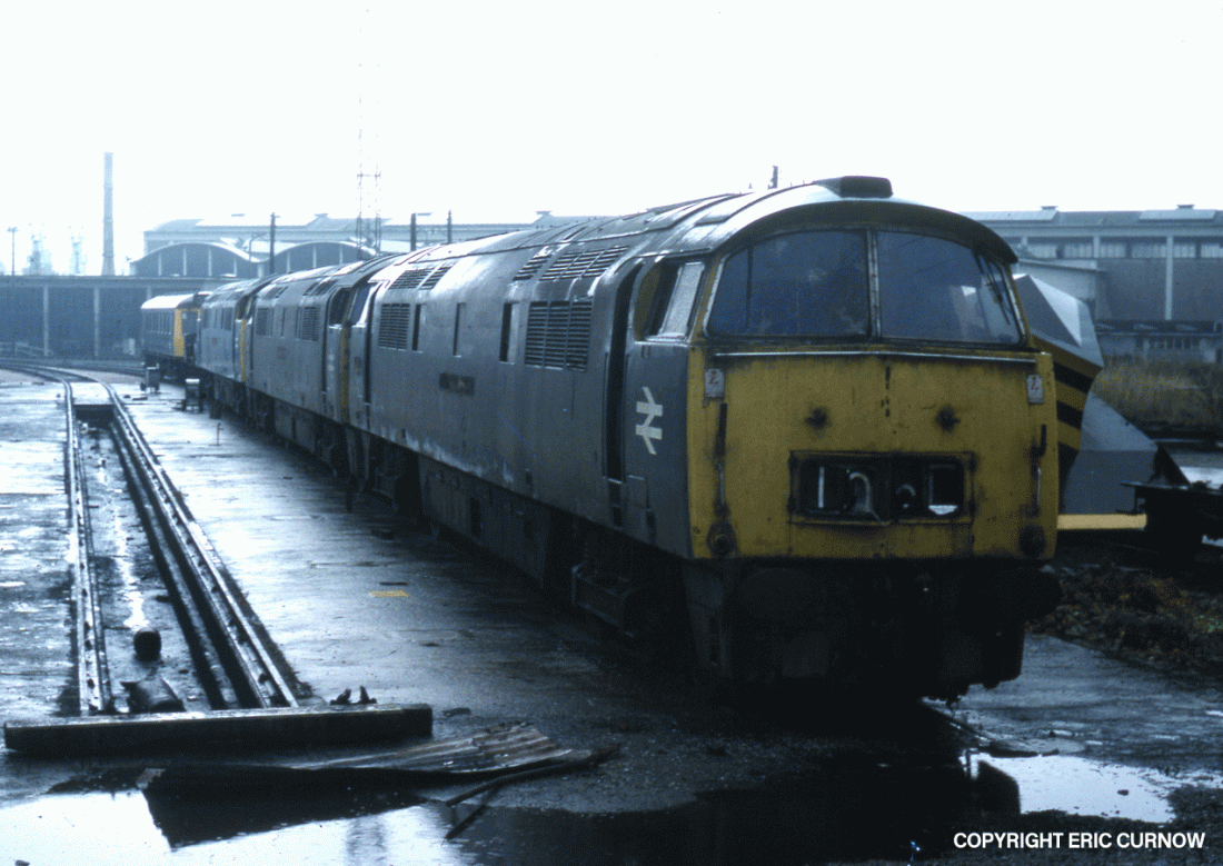 A dismal day adds poignancy to the sad sight of three ‘Western”s stored awaiting disposal at Laira depot. The sunken trackbed for access below locomotives showed that this was once part of the old steam shed. 7#####A01-LRA-LOCOS-SCRAP