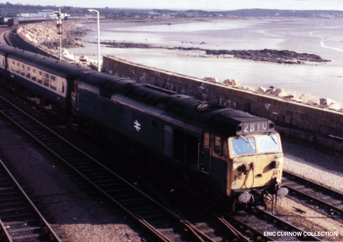 So – although a trip along the coast to Long Rock crossing, a quick visit to the sheds, and on by road to cross the line again at Ponsondane was my normal loco spotting route, I would often extend it to Long Rock open crossing (as there is a convenient sea side toilet nearby; and on the other side of the crossing a sweet shop), or Marazion station bridge – or even the Mount – if I had plenty of time. The setting for Marazion station is rural, as the adjacent marshes are tranquil, and the blackberry bushes growing in profusion; these were also an enticement sometimes. Yet all the time, the Westerns that powered through, “sounding their whistles” in response to the ‘SW’ board, were deteriorating, and gradually yielding to class 47s and 50s.