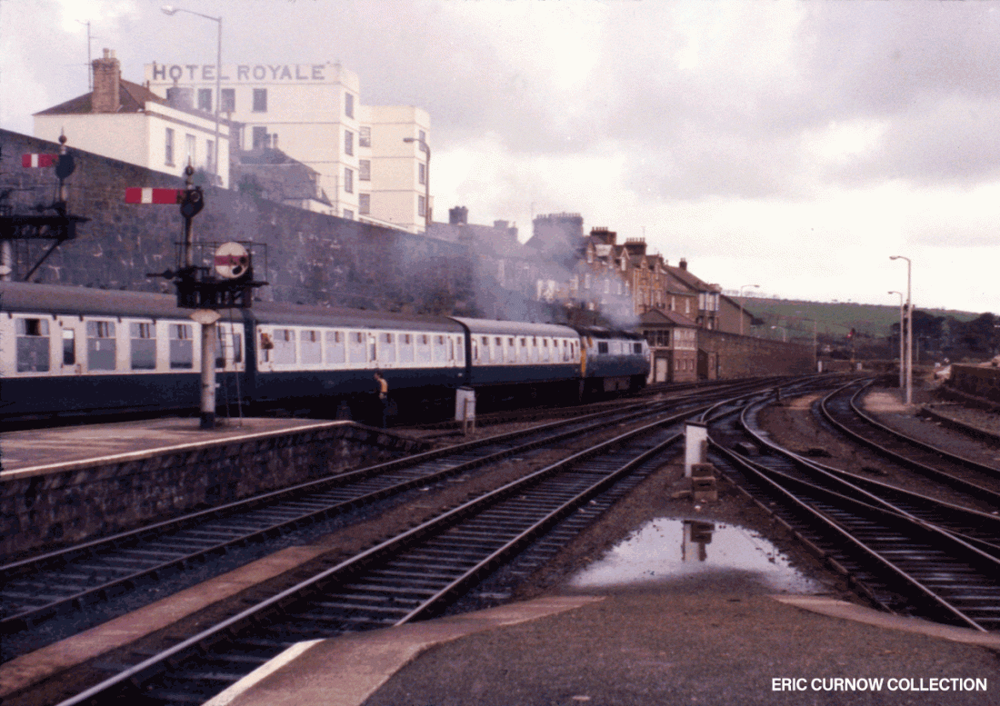 D1058 “WESTERN NOBLEMAN” leaves Penzance with an up service, as a carriage cleaner waits for access to the railmen’s mess situated just behind the loco. A large puddle has accumulated at the end of Platform 3. 75###AE01-PNZ-D1058-PAS_U