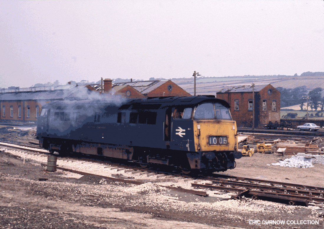Smoking exhaust as it creeps over newly-laid track, D1005 “WESTERN VENTURER” heads for the sheds past building work that includes a wall for an ancillary building. The roofs of the old buildings are in a very poor state. 74###AH01-LRK-D1005-LIG_U