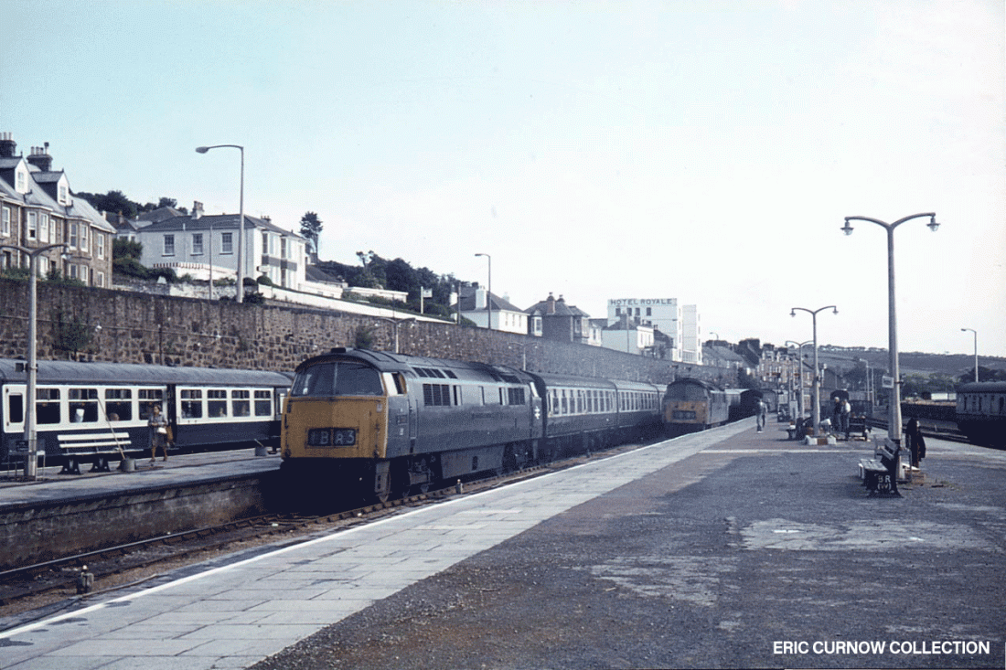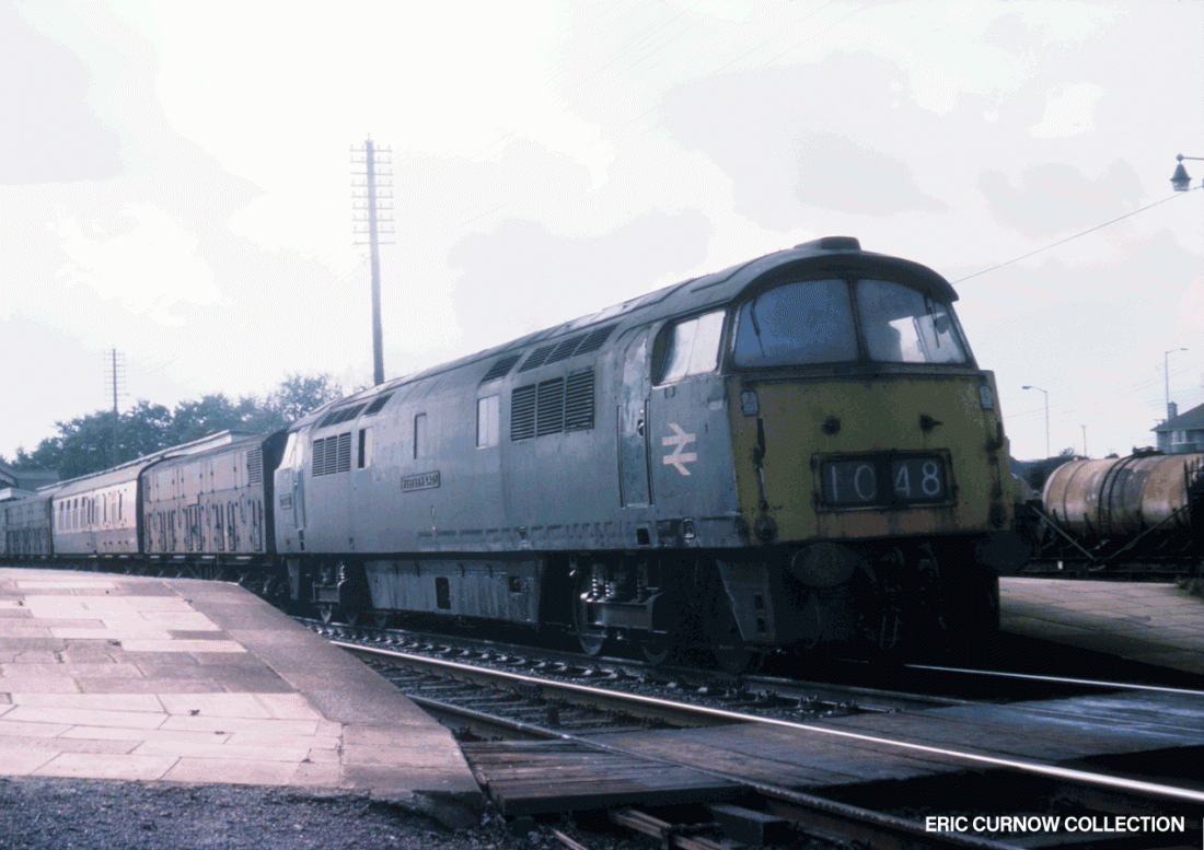 A battered D1048 “WESTERN LADY” heads an up perishables train at St Erth. The westbound platform ramp lies in the foreground, telegraph poles still flank the line, and milk tanks from the creamery awaiting movement east are parked in the yard behind. 761002B01-SER-D1048-VAN_U