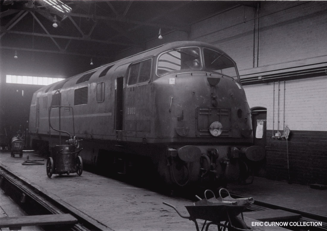 The north western corner of Long Rock Depot shelters D803 “ALBION’, next to the ‘Enginemen’ room, and the foreman’s office to its left. I used those wooden bridges across the inspection trench many times to avoid staff, when packed with locos. 6####FZ01-LRK–D803-PARKD