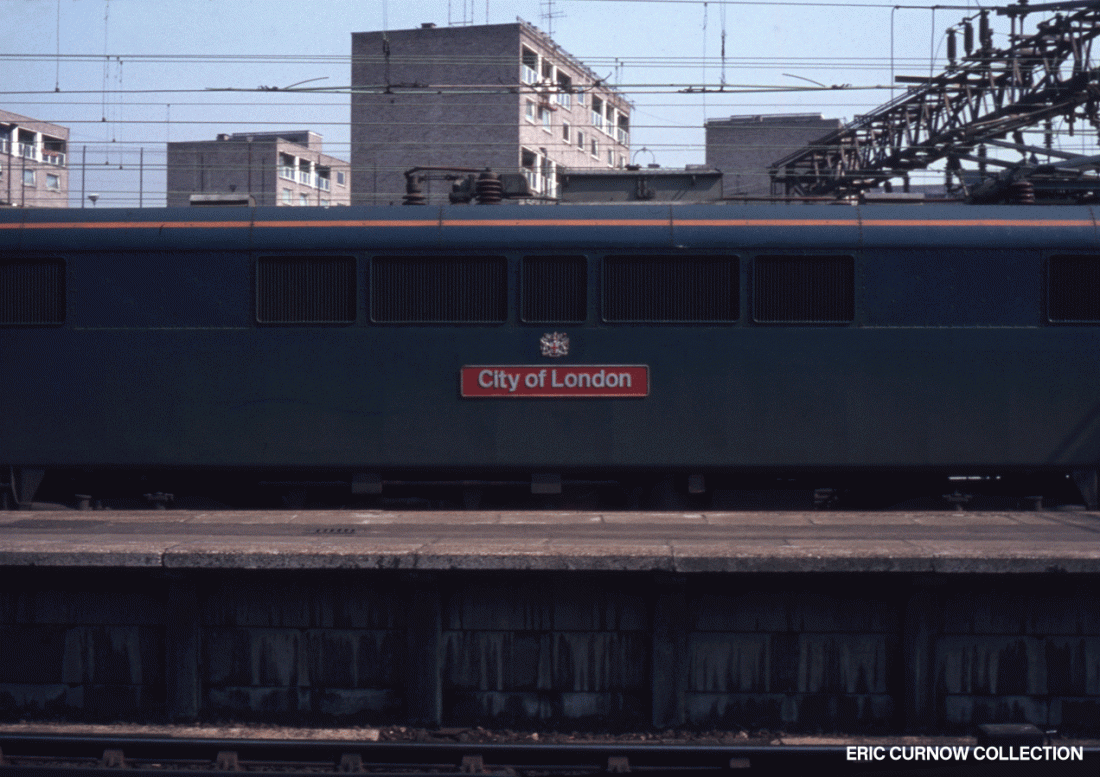 Under the wires at Euston, with the council flats to the east of the station behind it, the bodyside of 87005 shows the crest and nameplate of ‘City of London’ in rail alphabet, neatly and simply framed. Like the Class 50s, the 87s were BR’s epitome. 8####AT01-EUS-87005-PAS_D