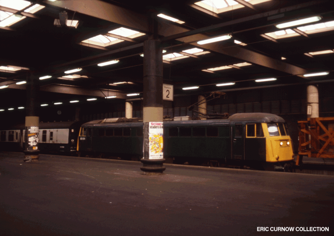 Platform 2 at Euston was my usual route through the station from the Underground and up the taxi run to Camden Town, pausing at the top to survey the traffic for a while. 85011 with domino light headcodes waits with an “Up” passenger service at the stop blocks. 7910#AE01-EUS-85011-PAS_U