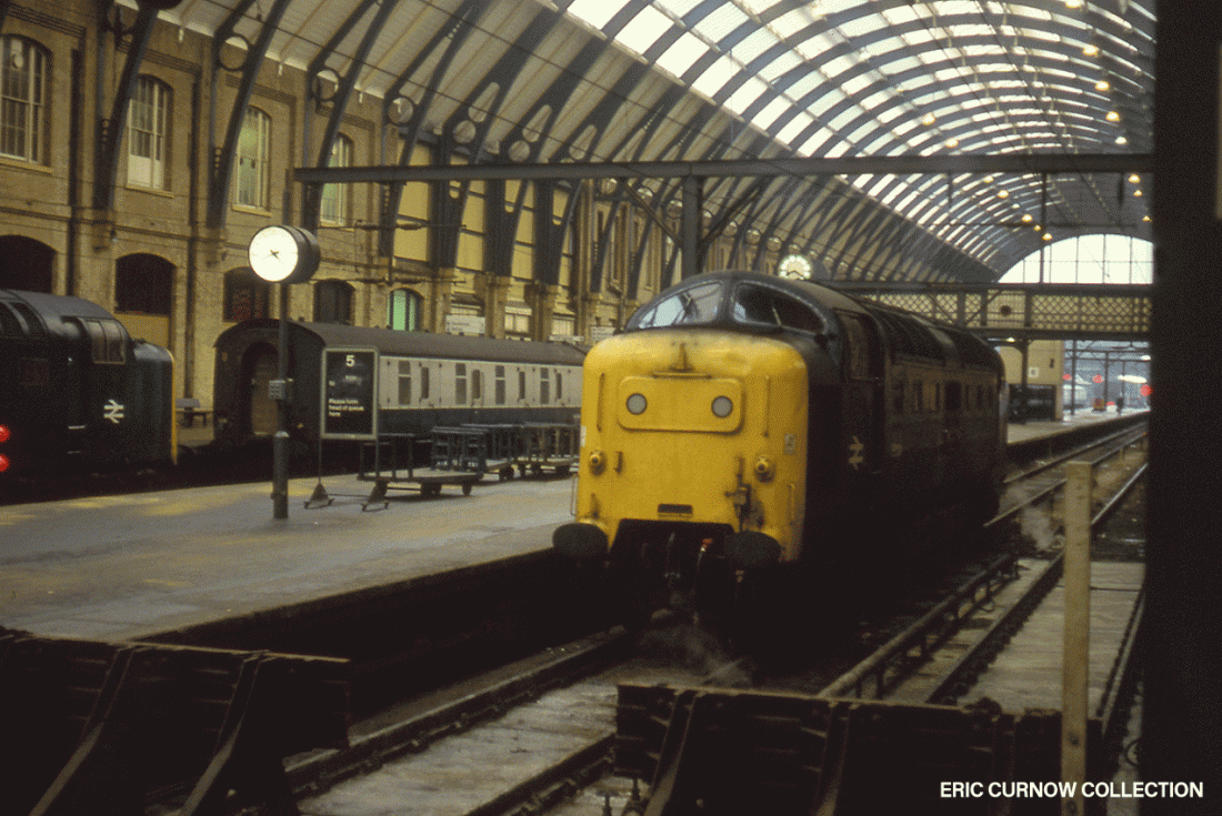 The powerful appearance of ‘Deltics’ like 55004 “QUEEN’S OWN HIGHLANDER”, parked at King’s Cross Station, impressed me far more than any other diesel on the BR network – even ‘Westerns’. Their engine roar matched their sleek and ‘substantial’ presence. 80###AA01-KGX-55004-PAS_U