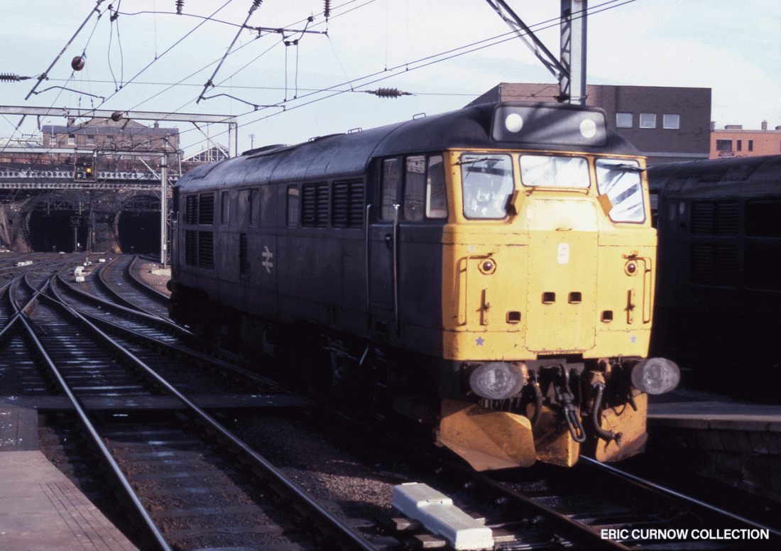 Fitted with “snowploughs”, 31115 has a “yellow” to proceed out of King’s Cross station at a maximum of 15mph towards the tunnels under the canal. A class mate is parked beside it, the new signal box is beyond, and on the sky line are the old goods warehouses. 830305A01-KGX-31115-LIGHT