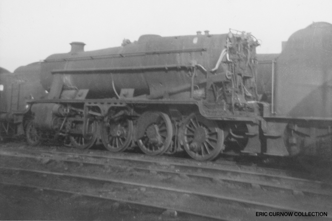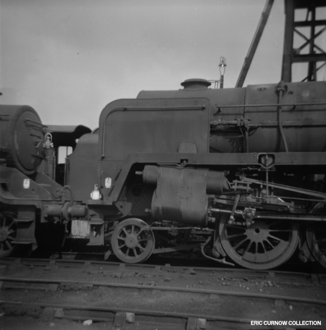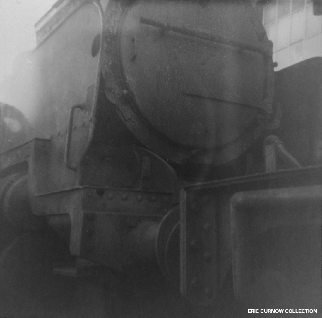 This picture of a 3822’s tender nicely displays the continuity of the ‘Great Western Railway’ into ‘British Railways’ – the nationalised “lion and dartboard’ transfer having been applied over the former writing, and weathering has removed the paint that covered that. The beading strip above the text has protected the logos from the fate of the panel above. 6#####999-BRY-TENDR-SCRAP