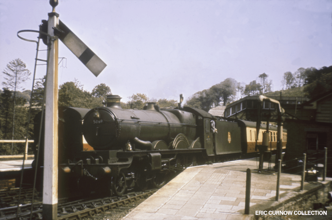 Castle Class 5069 “ISAMBARD KINGDOM BRUNEL” pauses at Bodmin Road Station on its way west – a train of GWR-style “chocolate and cream” carriages behind and BR “blood and custard” beside it. The long curved nameplate was probably the longest in service, and although not in ‘pristine’ condition, the brasswork all over the locomotive still gleams. 5####CX01-BOD-s5069-PAS_D