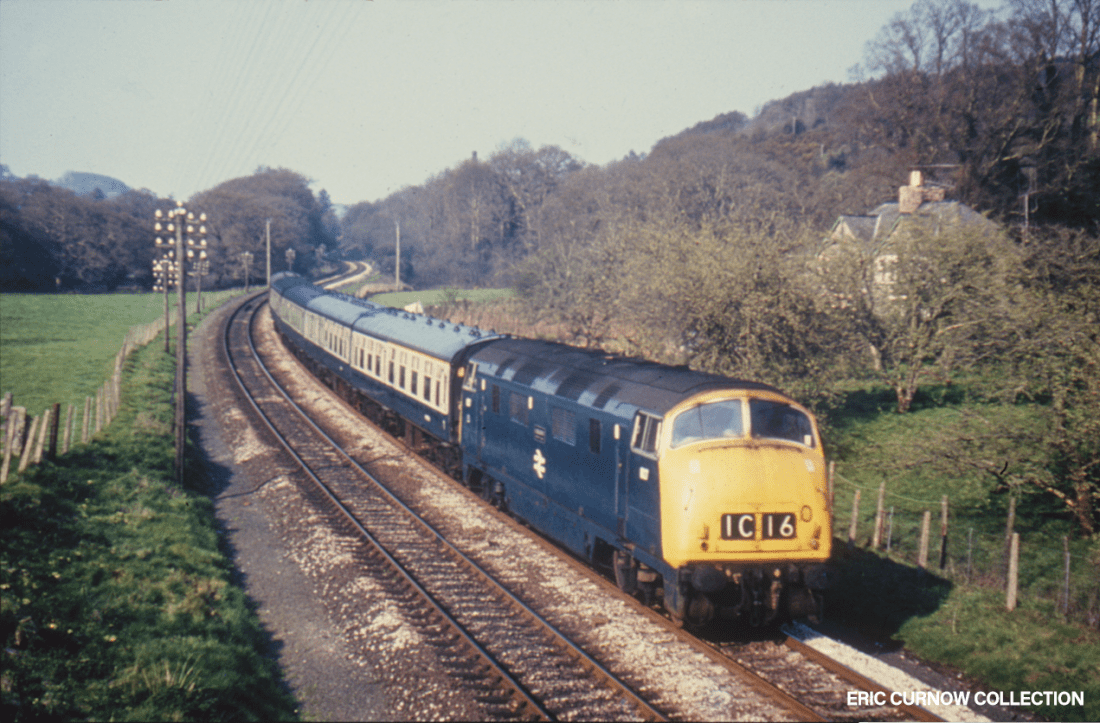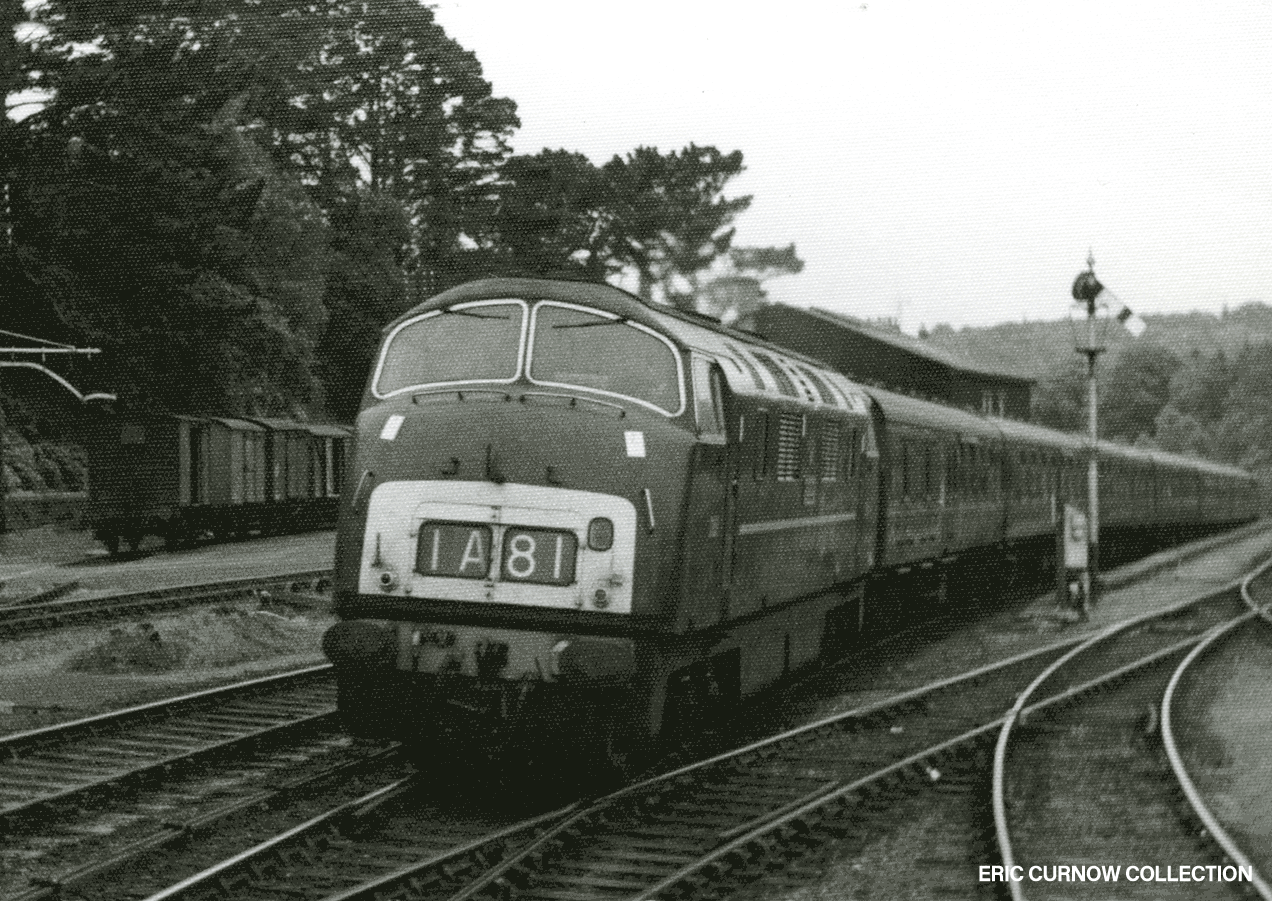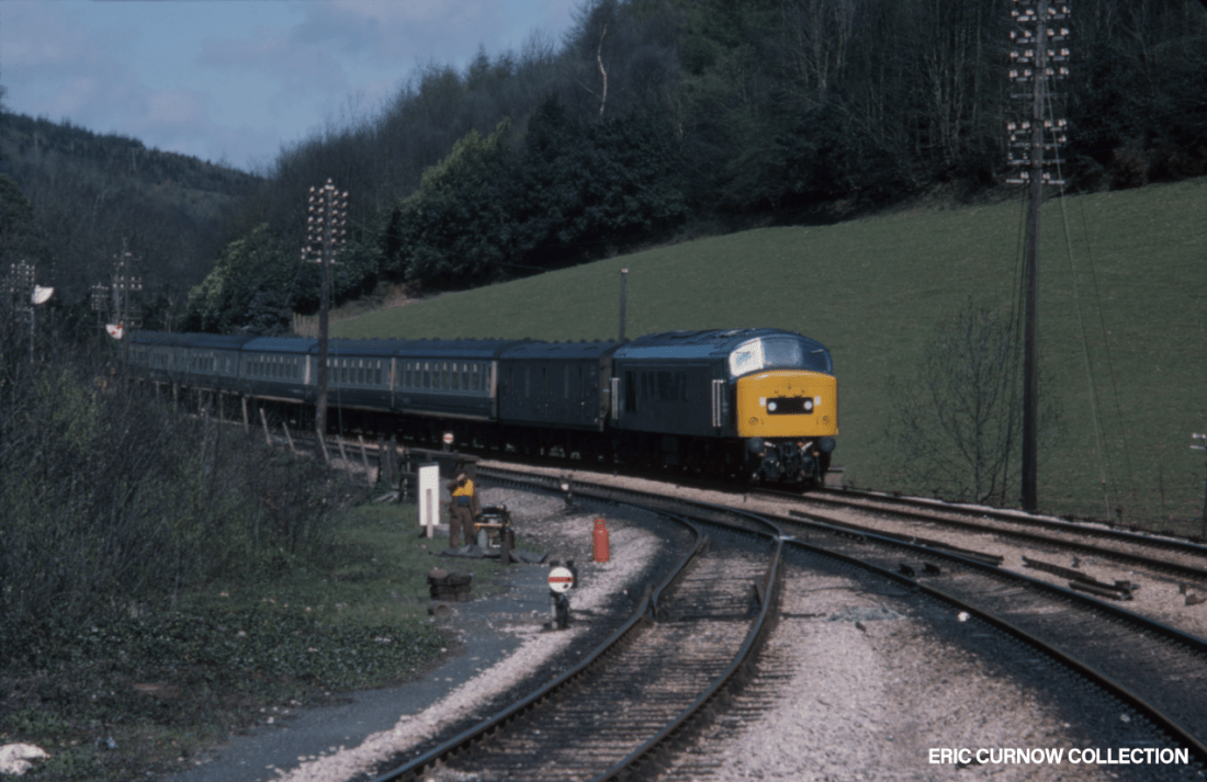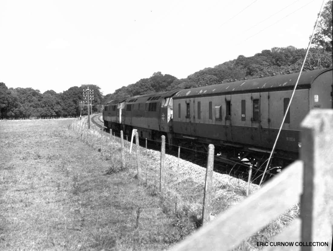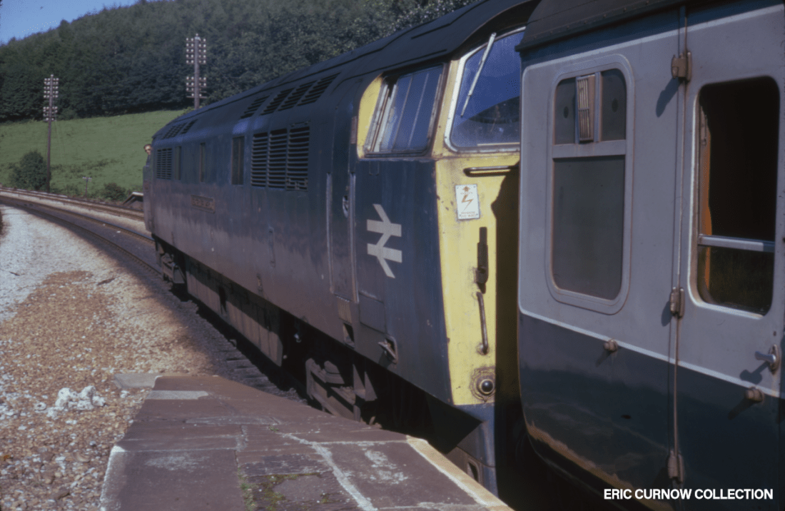 D807 “CARADOC” pulls an up passemger service through Respryn between Loswithiel and Bodmin in the early 1970s. The whole consist is finished in commendably neat BR blue – the loco in the style I liked best; without the ‘D’ prefix to its number, and in rail alphabet. “CARADOC” was one of the Class 42s I saw more freqently than the others of the class. 7####HF01-BOD–D807-PAS_U