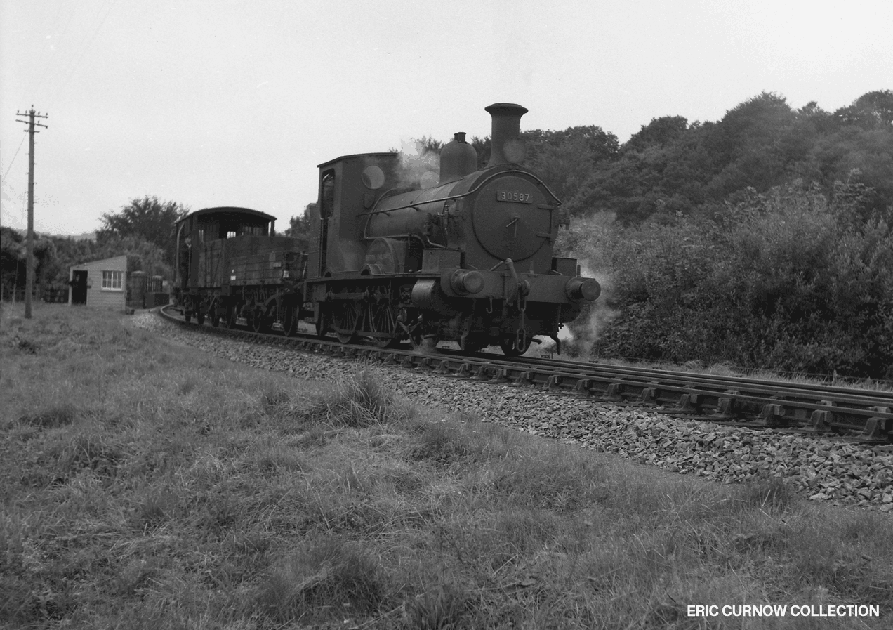 The eyes of the driver and guard are fixed on the route ahead as 30587 runs its lightly loaded pick-up goods across the points onto the Wenfordbridge branch at Dunmere Junction, watched by the signalman at the hut beside the bridge over the River Camel. The drop from this bridge to the water below is quite steep at this point. 5####CG01-DME-30587-GDS_O