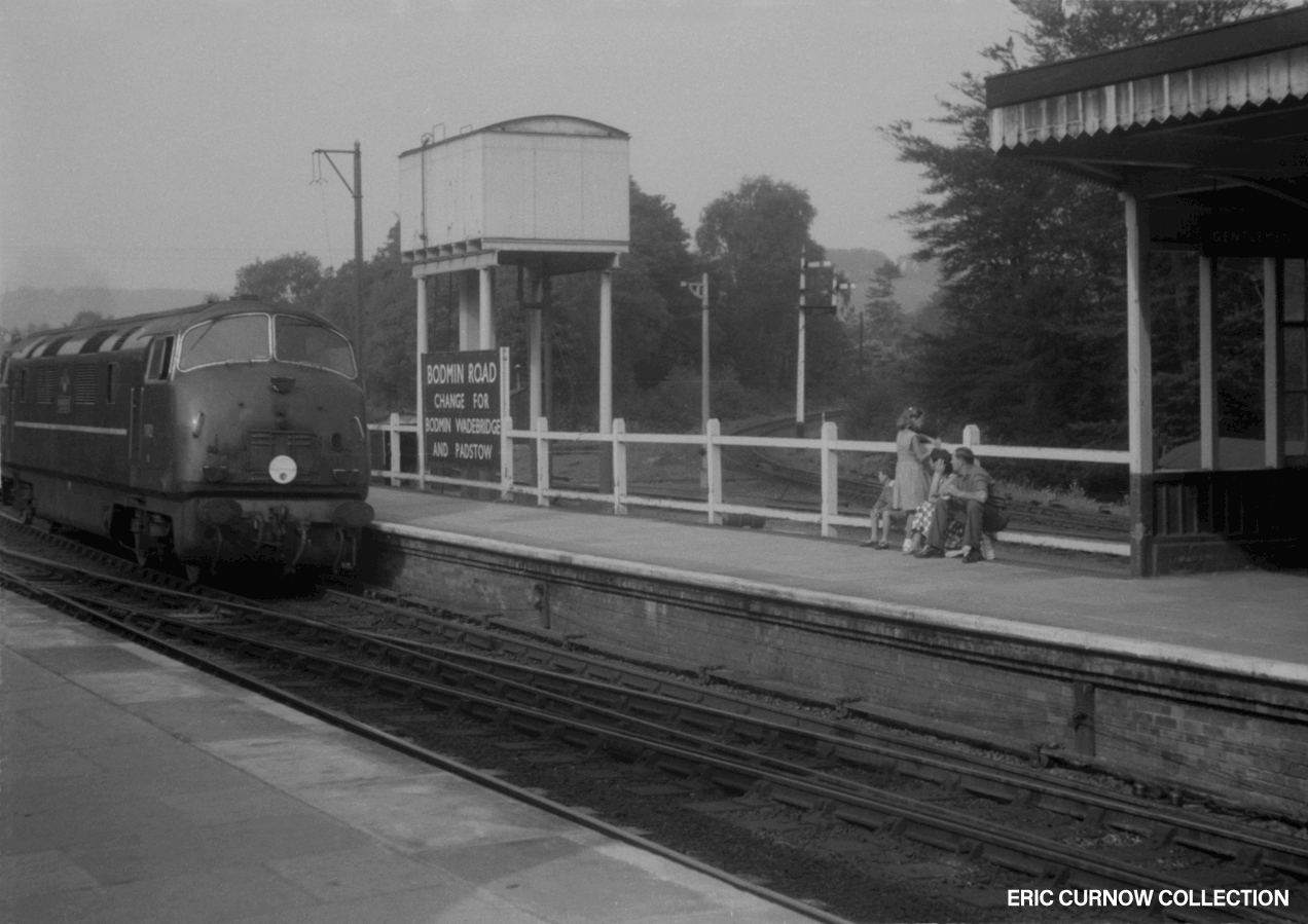 A family awaits their connecting mainline service on the up platform of Bodmin Road Station as one of the early D8XX Warships runs eastwards light engine. A crossover in the 6′ was still in use at this time, as was the goods yard, and the old shelter hadn’t yet been demolished. A water tower and signal array dominates the background. 6####HM01-BOD–D802-LIG_U