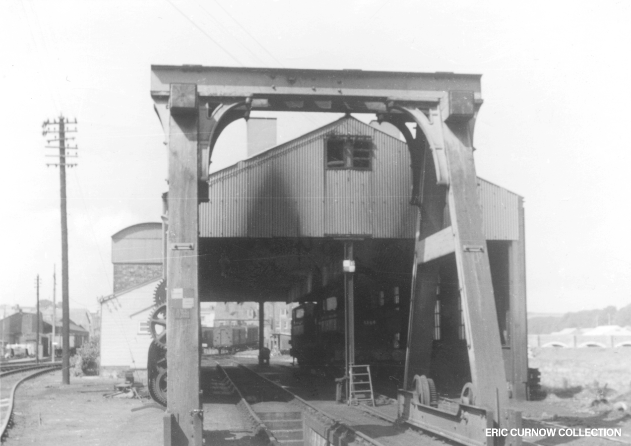 Resident 1369 0-6-0 Great Western tank engine and a classmate are sheltered inside Wadebridge shed in 1964. There is a hoist and maintenance pit before it, and goods shed and water tower behind – the arches of the bridge are to the right. Vans can also be seen through the apeture of the shed, and restricted access signs on girders before it. 64###AL01-WBG-E_SHD-VI_NW