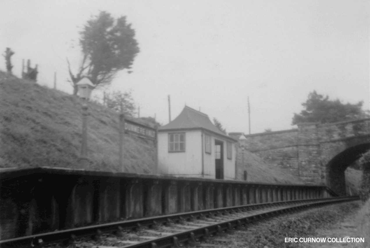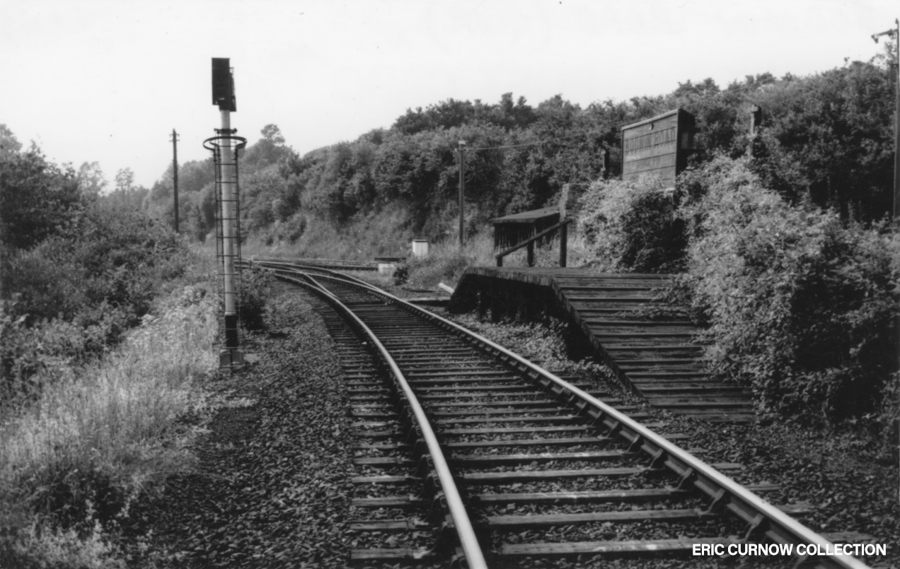 The route from Bodmin Town towards Padstow intersected with a line to Bodmin General at Boscarne Junction, where a ‘Halt’ consisted of a short platform on each deviation, connected by a half-minute walk between them. This is the GWR arm, with the route to Wadebridge to the left and Bodmin Town to the right, behind the running in board. 56###AE01-BCX-STATN-VI__W