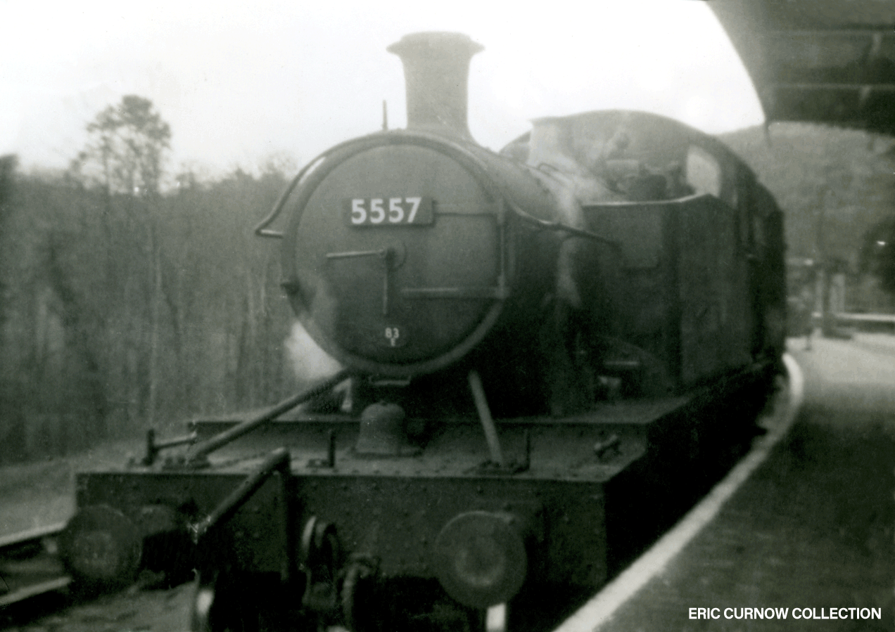 Simmering away at the branch platform of Bodmin Road Station is 45XX tank 5557, on the through train to Padstow. Its ’83E’ shed plate, the platform edge white stripe, and white stripes of the signal arms, stand stark against the grey of the winter’s day. 57###AB01-BOD-s5557-PAS_O
