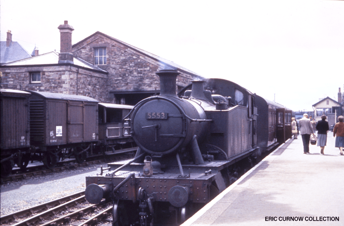 A peaceful scene at Bodmin General of 5553, recently arrived from Bodmin Road on the GWR main line. Its mere two carriage train and scattered passengers hint at why such services were financial drains on the BR budget, though even their limited operationss were appreciated by those without cars. The vans to its left show freight services were still fairly commonplace in 1961. 61####B01-BOD-s5553-PAS_O