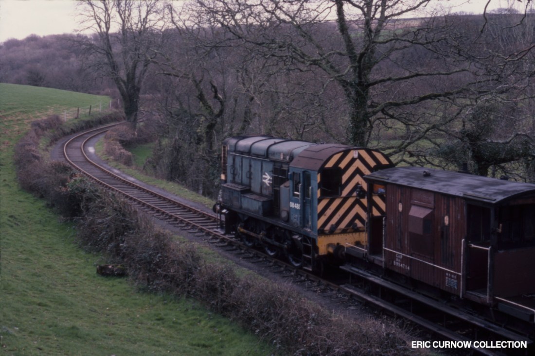 08488 trundles down the winding single track route from Wenford Bridge with a brake van and china clay working for Fowey docks on 6th April 1983. In the background is Dunmere Wood and to the right behind the line the fields drop down to the River Camel below. I heard such a train from Pencarrow at a Scout camp nearby, but never saw one in operation. 830406A01-WFB-08488-GDS_I