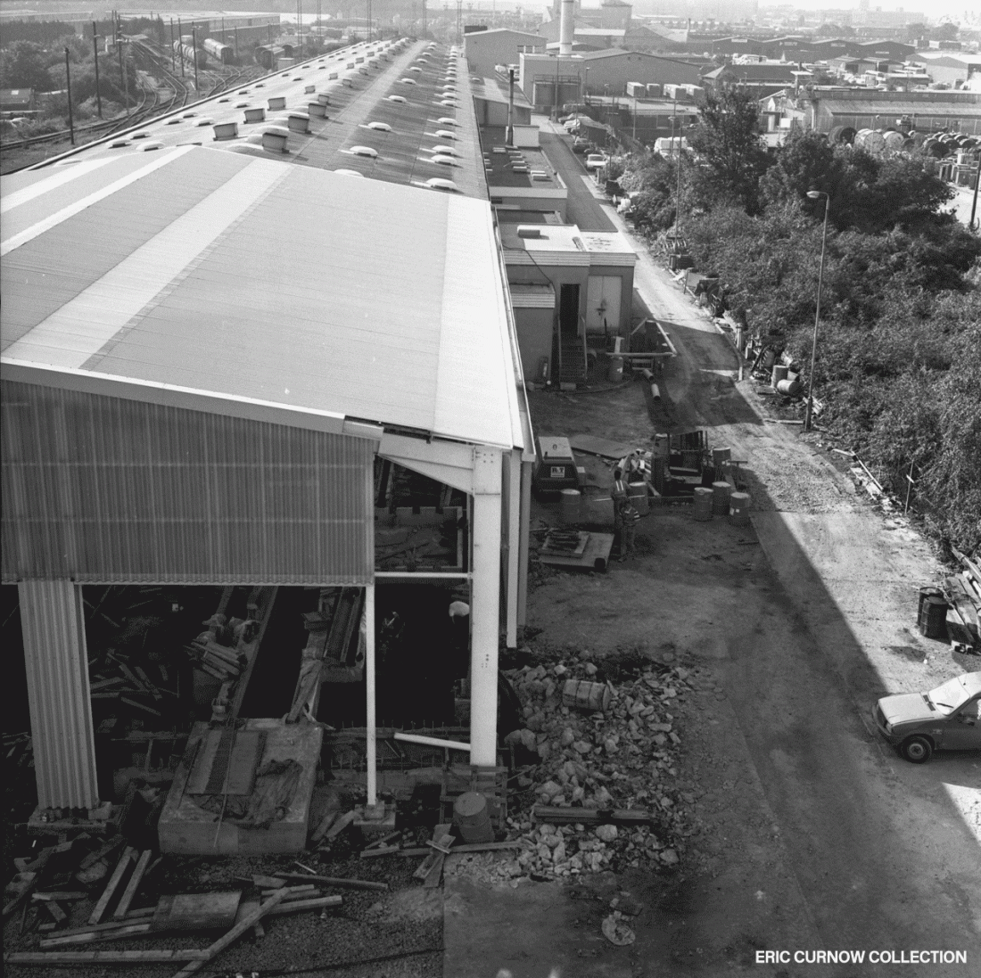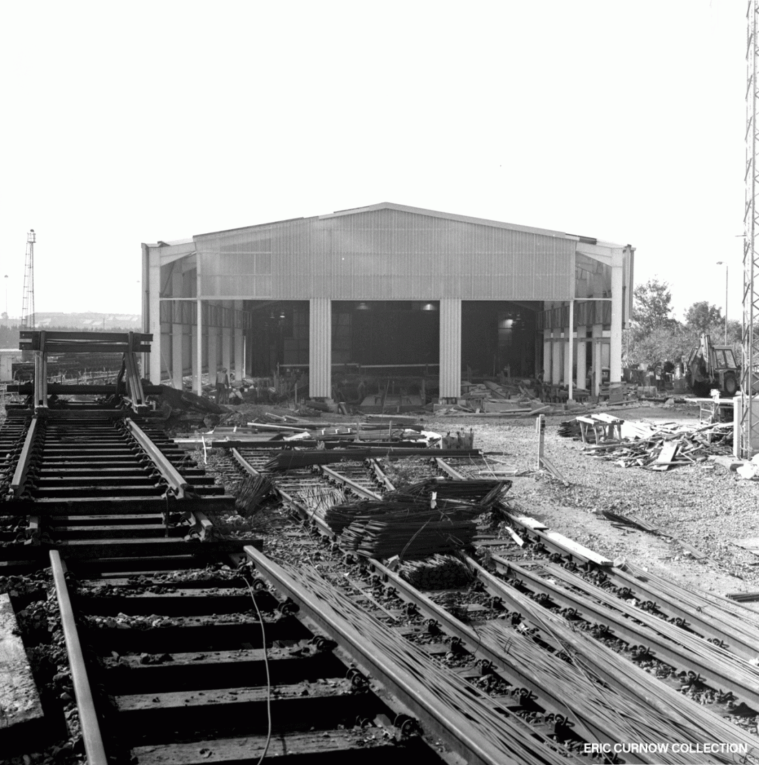 David Beresford worked on this building project and has more photos at https://flic.kr/s/aHBqjBGeBh David was a trainee site engineer working for George Wimpey there between April and August 1975. Work was pretty well advanced when he arrived with the main shed and track work in place and he was given several areas to deal with and set out the concrete paths between the Victoria siding tracks, the main access road, the pits to the drainage interceptor, a cleaners building and other concrete bases. The most precise area of work he had to deal with was lining and levelling the rails in the main depot shed. He says, “It was always very exciting when a train or loco came on to the site to deliver something or test the track. We also had at various times cranes on site to lift the lighting gantries and towers into place. I left the site when most of the building work was complete with only the M&E commissioning and fit out by British Rail left to do. Before I left, I managed to take photos using my trusty Kodak Instamatic camera. It would not be allowed now but I did manage to climb to the top of the lighting towers and gantries to get some pictures – it was a bit wobbly up there. The photos annotated with P numbers are print scans whilst those annotated N are from the original negatives. Unfortunately, the negatives have deteriorated over the intervening years resulting I believe in them losing their blue colour. I did try correcting some but my software was not good enough. Hopefully you find them interesting as a useful record of the depot as built.”