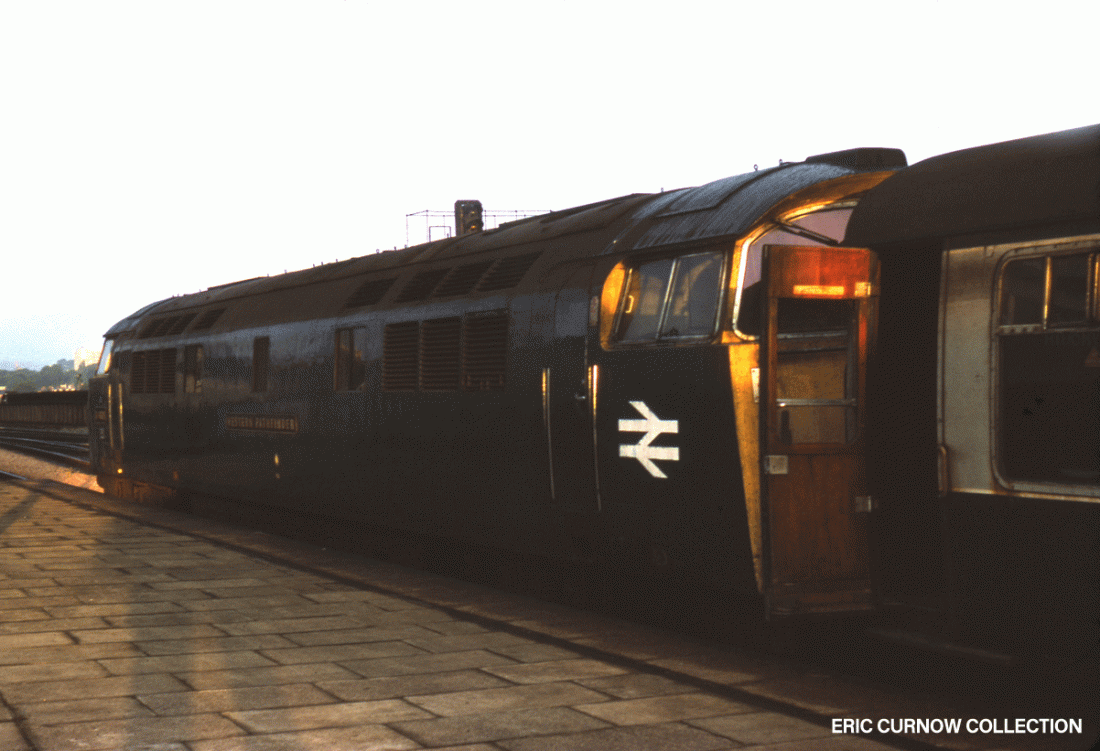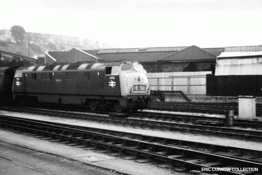 With the carriage door and exterior demonstrating the normal underinvestment of this period, D1001 “WESTERN PATHFINDER’ waits to resume its passenger service eastwards. The metal retaining walls of the station and Bristol’s townscape lie behind. 7####DZ01-BRI-D1001-PAS_U